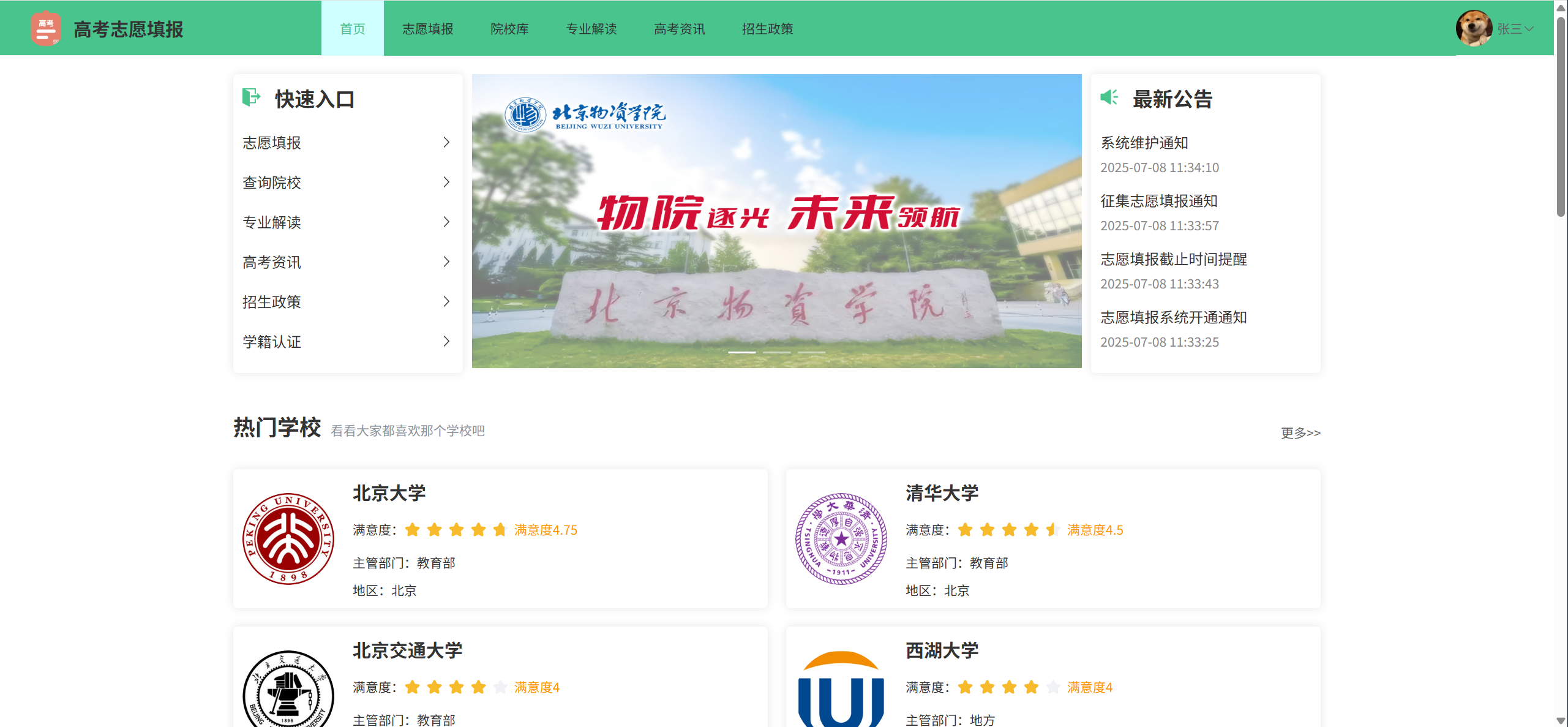 首页:轮播图,热门院校、最新招生简章,热门资讯