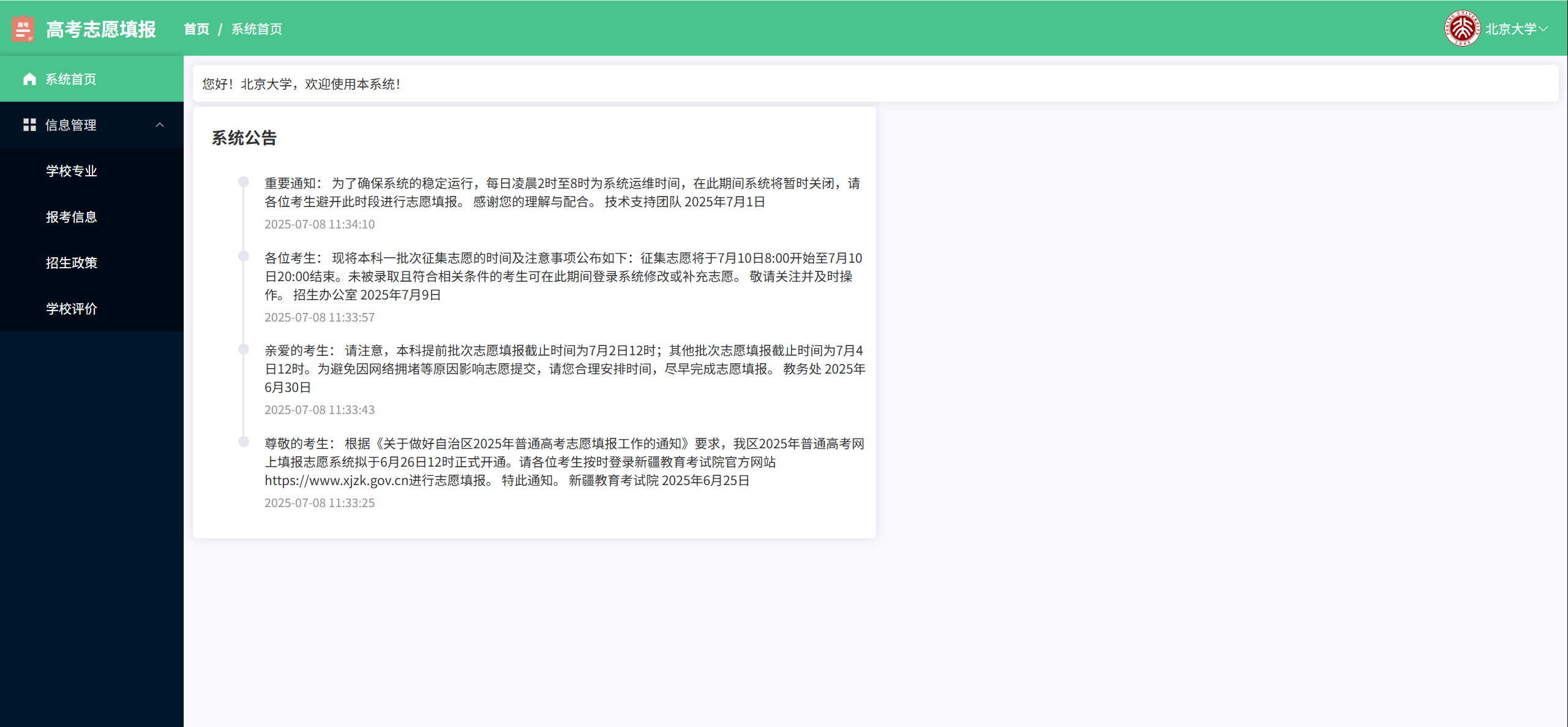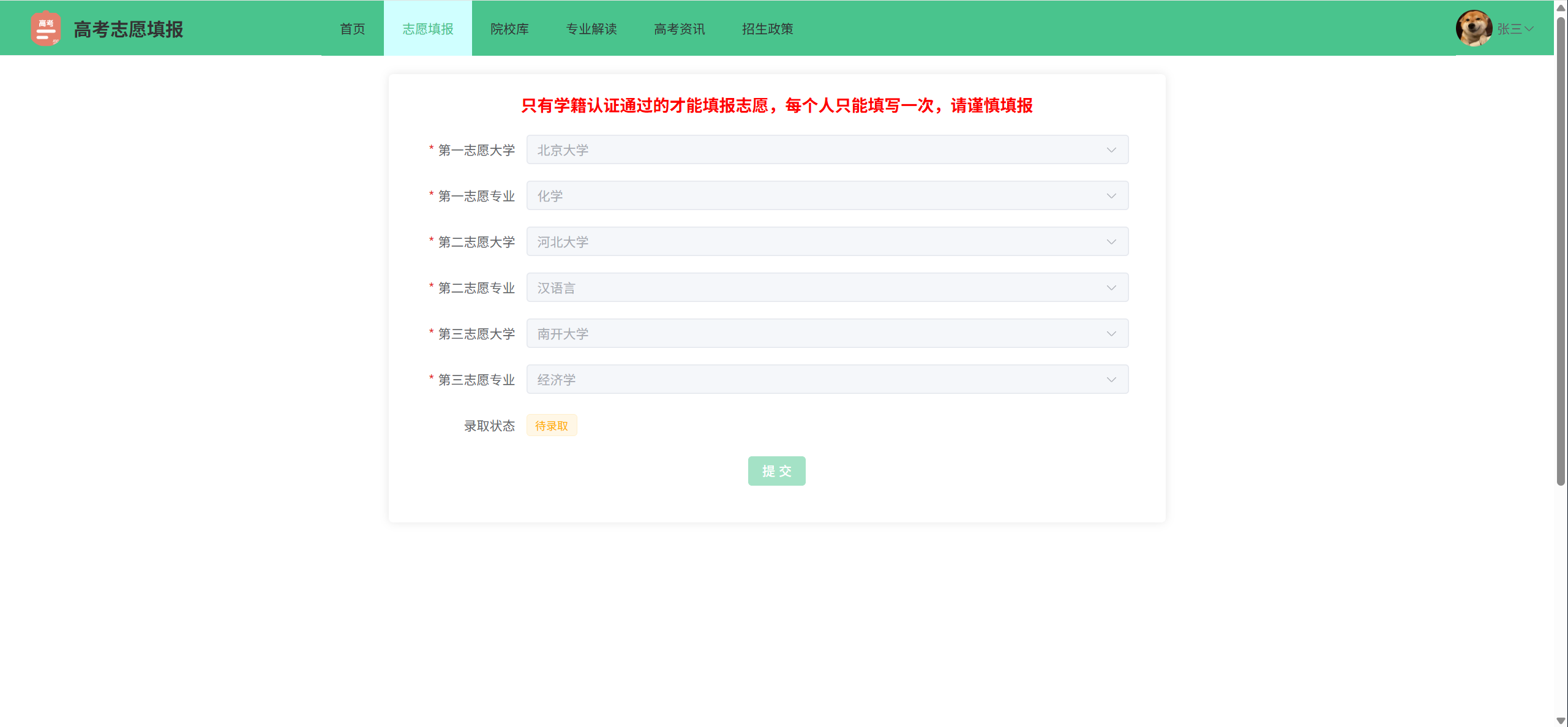 报名信息:管理学生的报名信息,每个学生可以选择三个志愿(每个学校选择一个专业),第一志愿,第二志愿,第三志愿,按照顺序依次录取,只有前一个录取失败,