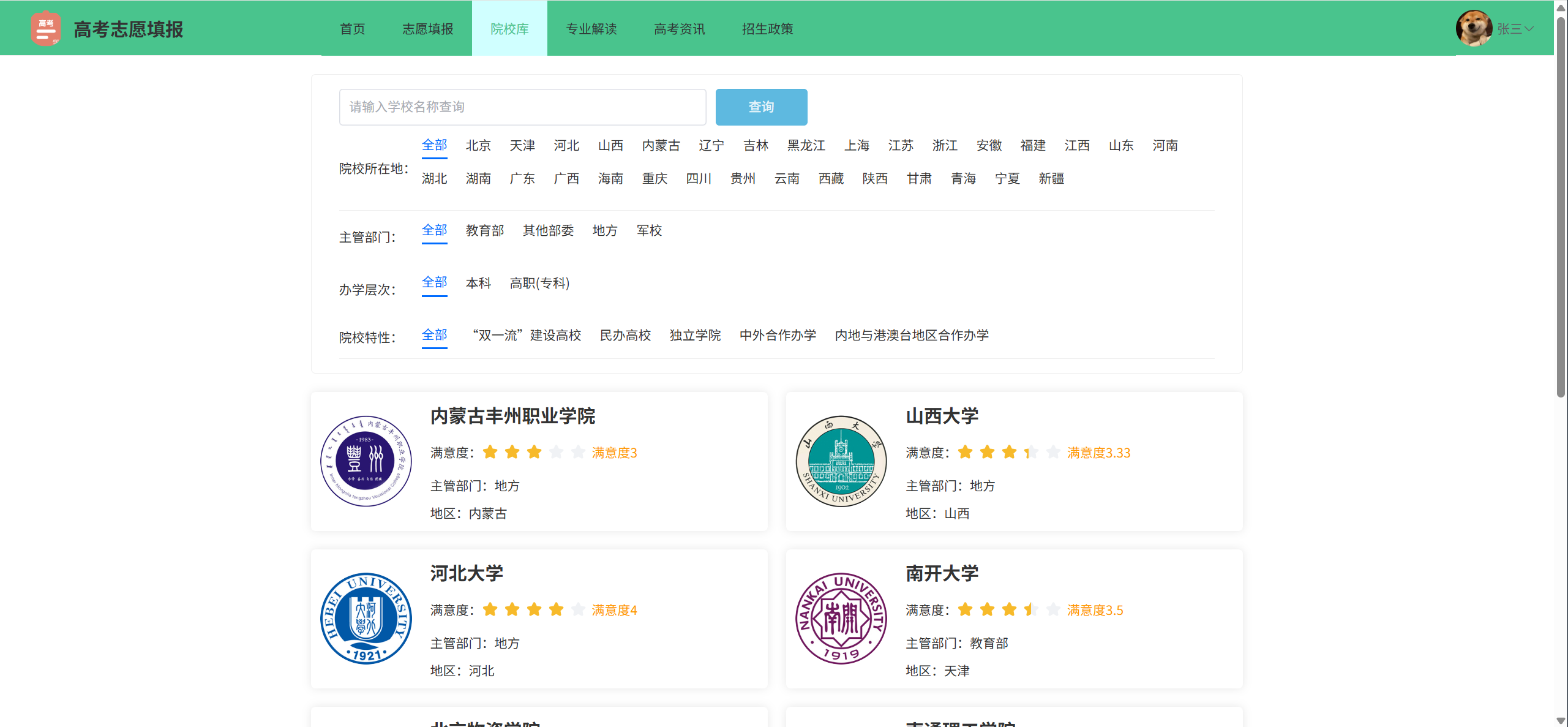 院校库:根据院校所在地、主管部门类别、办学层次和学校名称进行查询,点击可以进入学校详情页