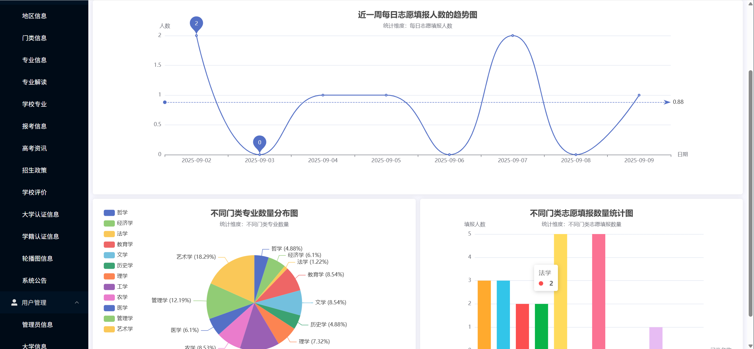 数据统计:统计近一周每日报名人数折线图,统计不同门类的专业数量饼状图,统计不同门类专业解读数量柱状图,统计门类数量,专业数量,学校数量,学生数量