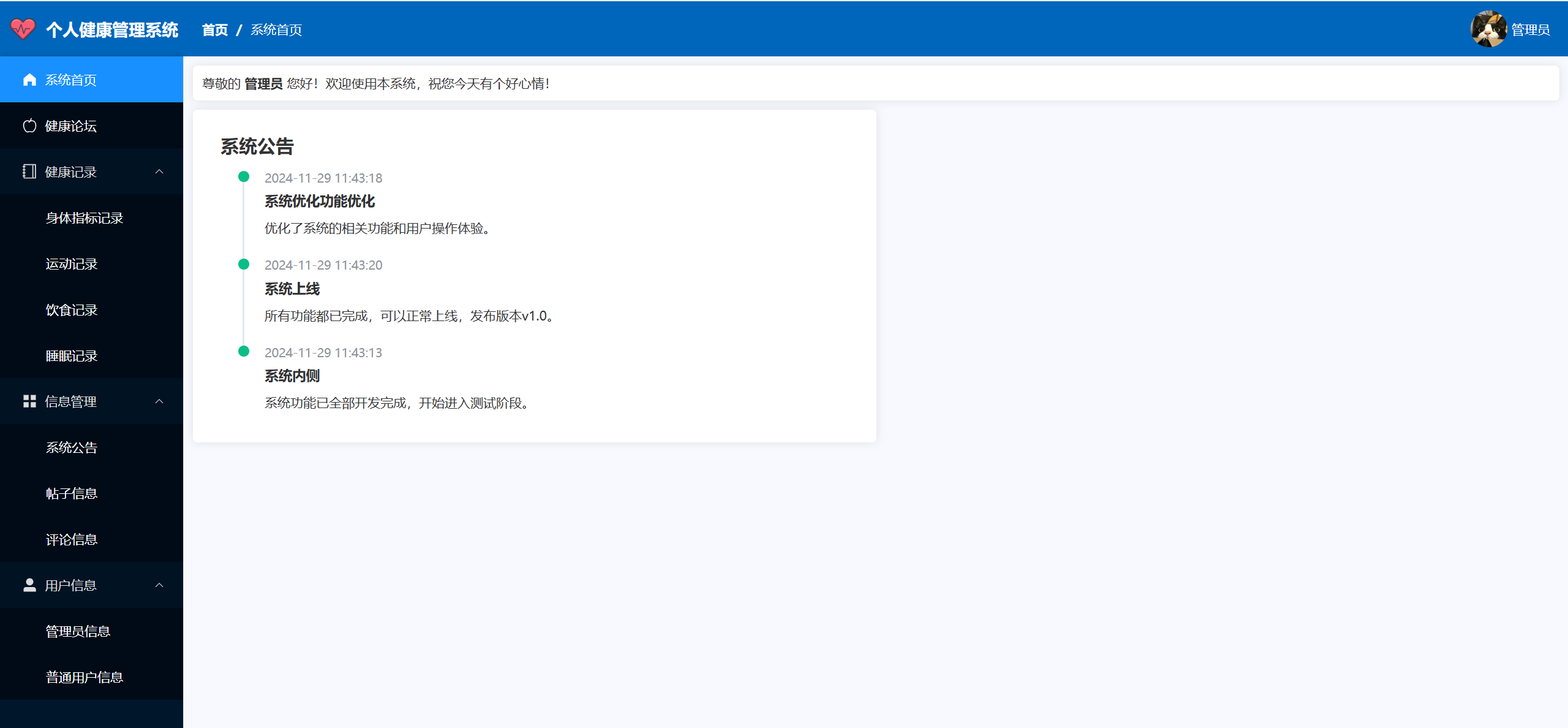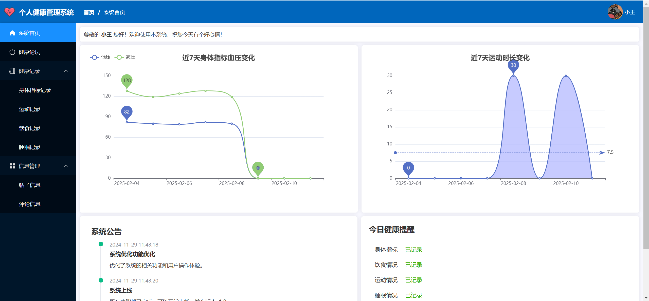 系统首页:健康指标数据统计、查看系统公告、每日健康提醒