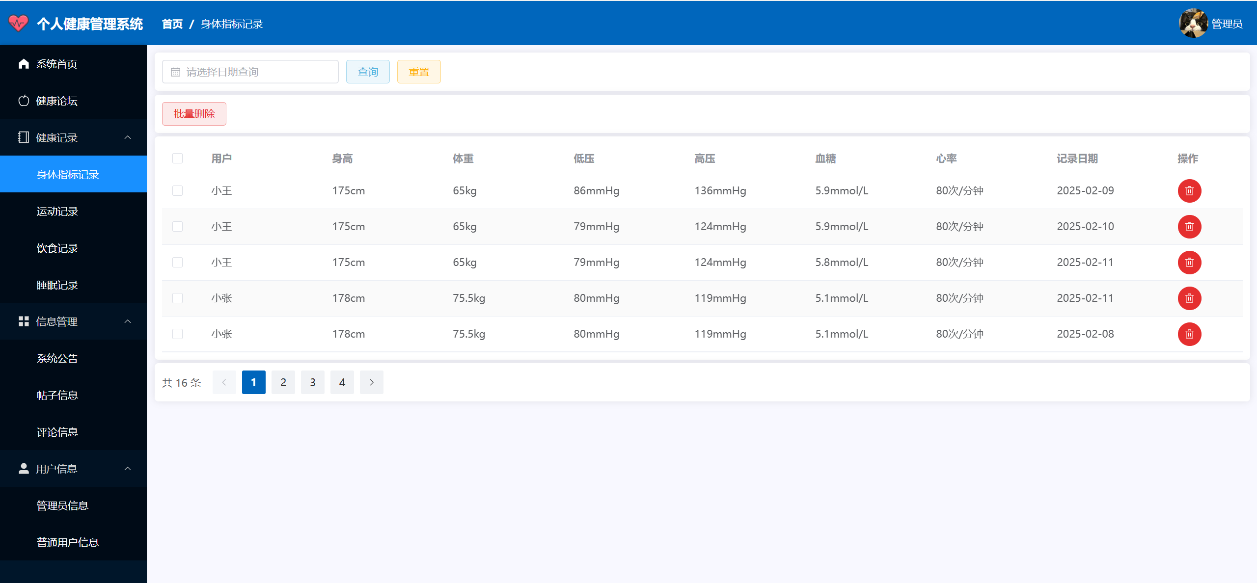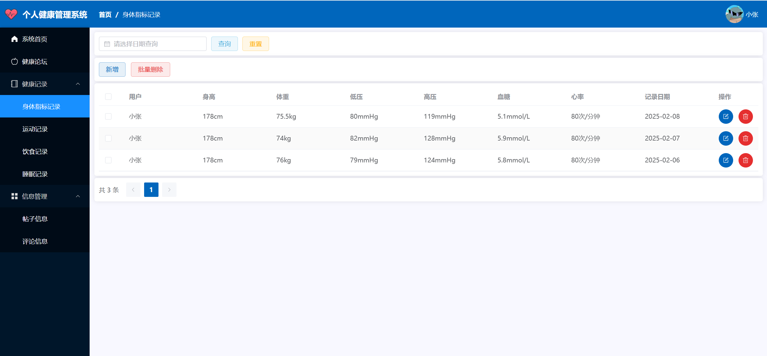 身体指标记录:对个人每日身体指标信息进行增删改查