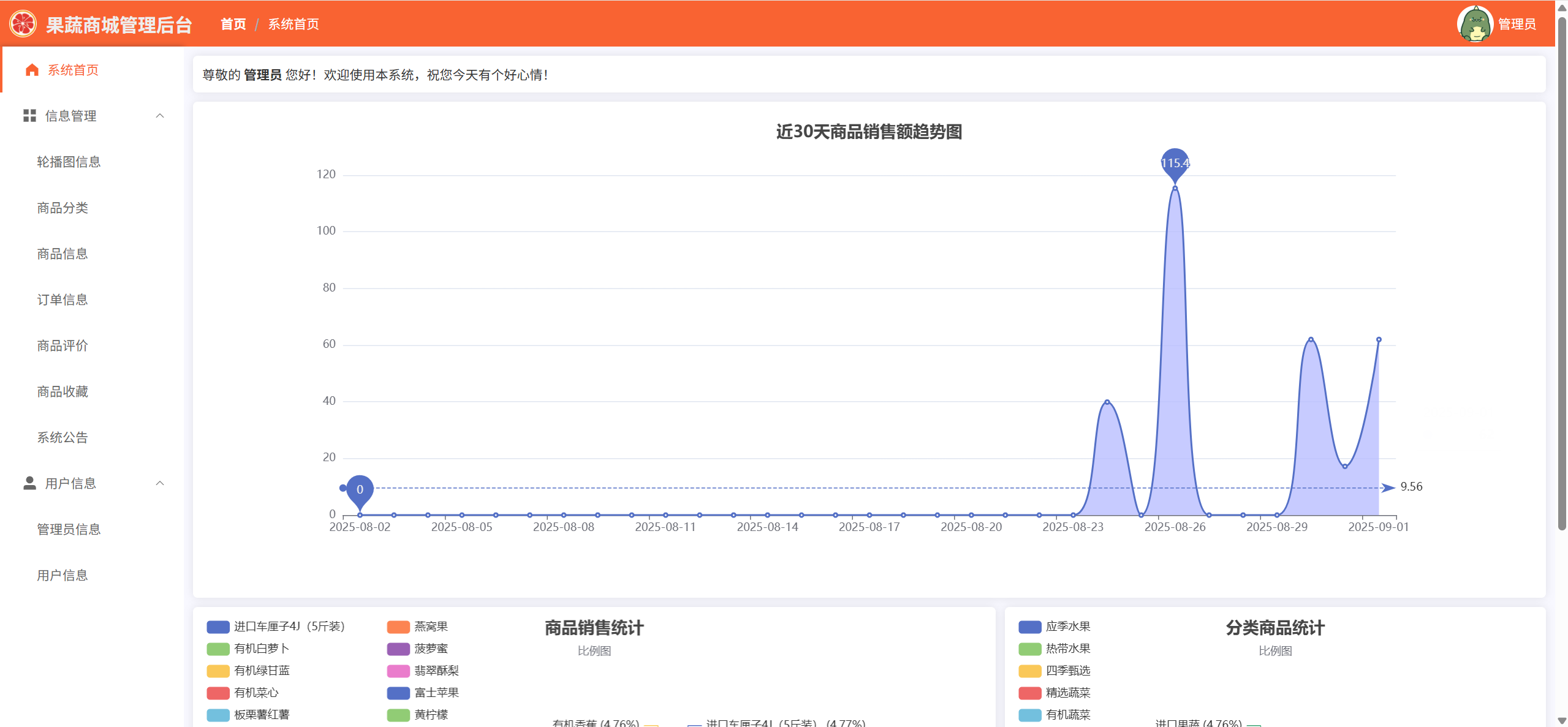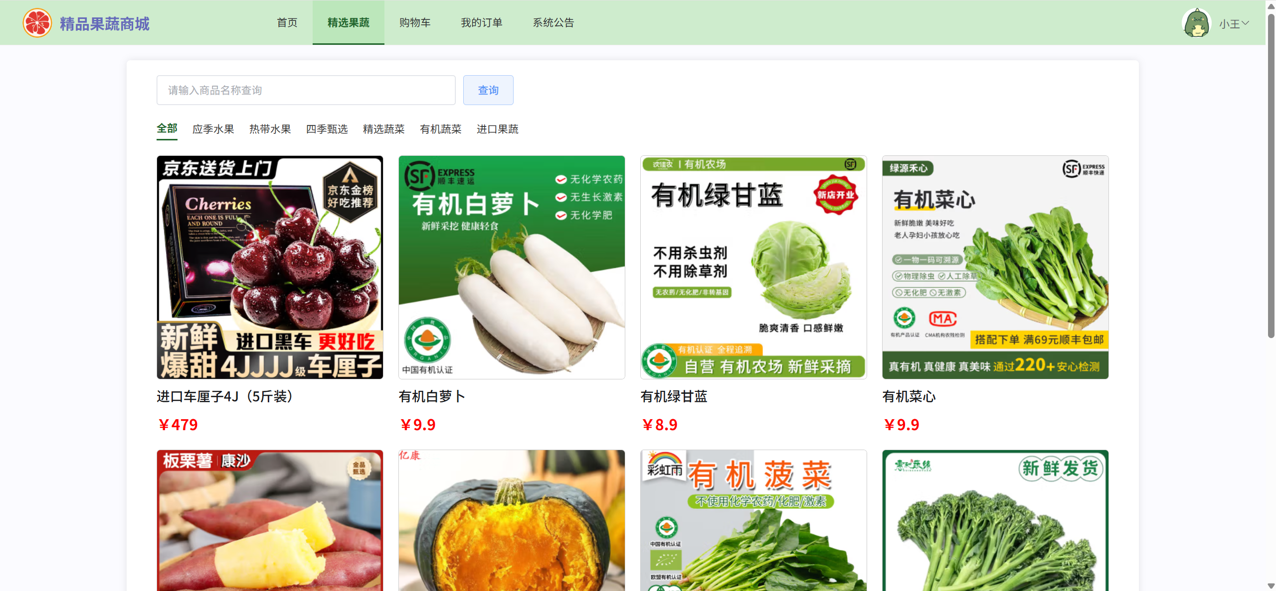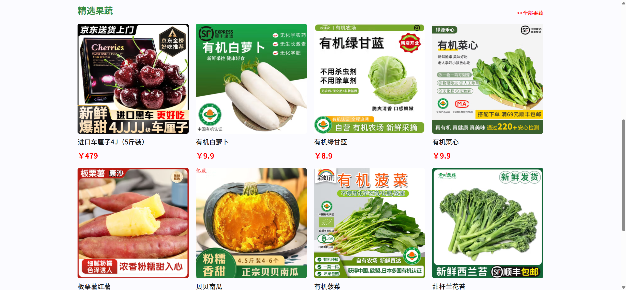 商城首页:轮播图宣传、热销商品(按销量从高往低排序展示 5 个)、精选果蔬