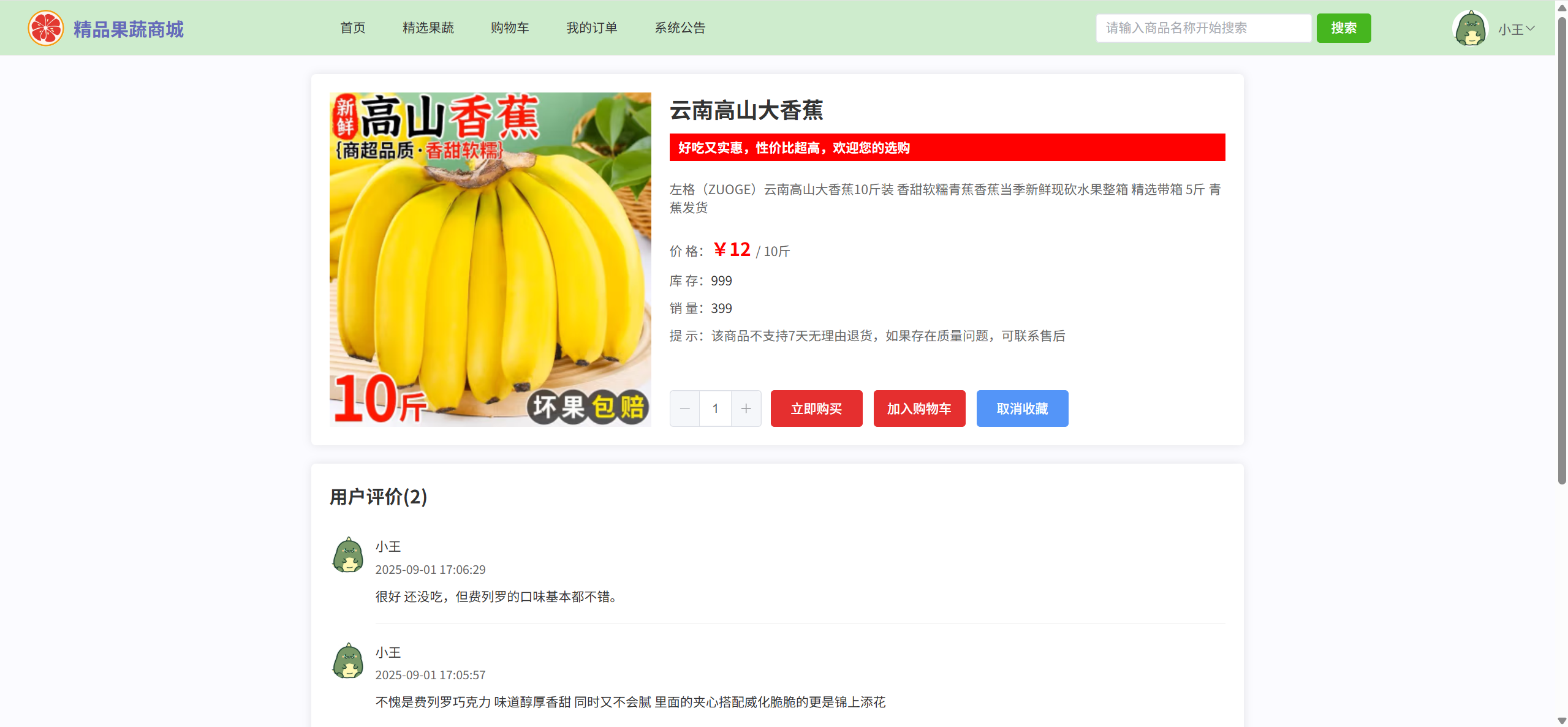 果蔬详情:展示果蔬详细信息、可购买下单、加入购物车、收藏、展示商品售后评价信息
