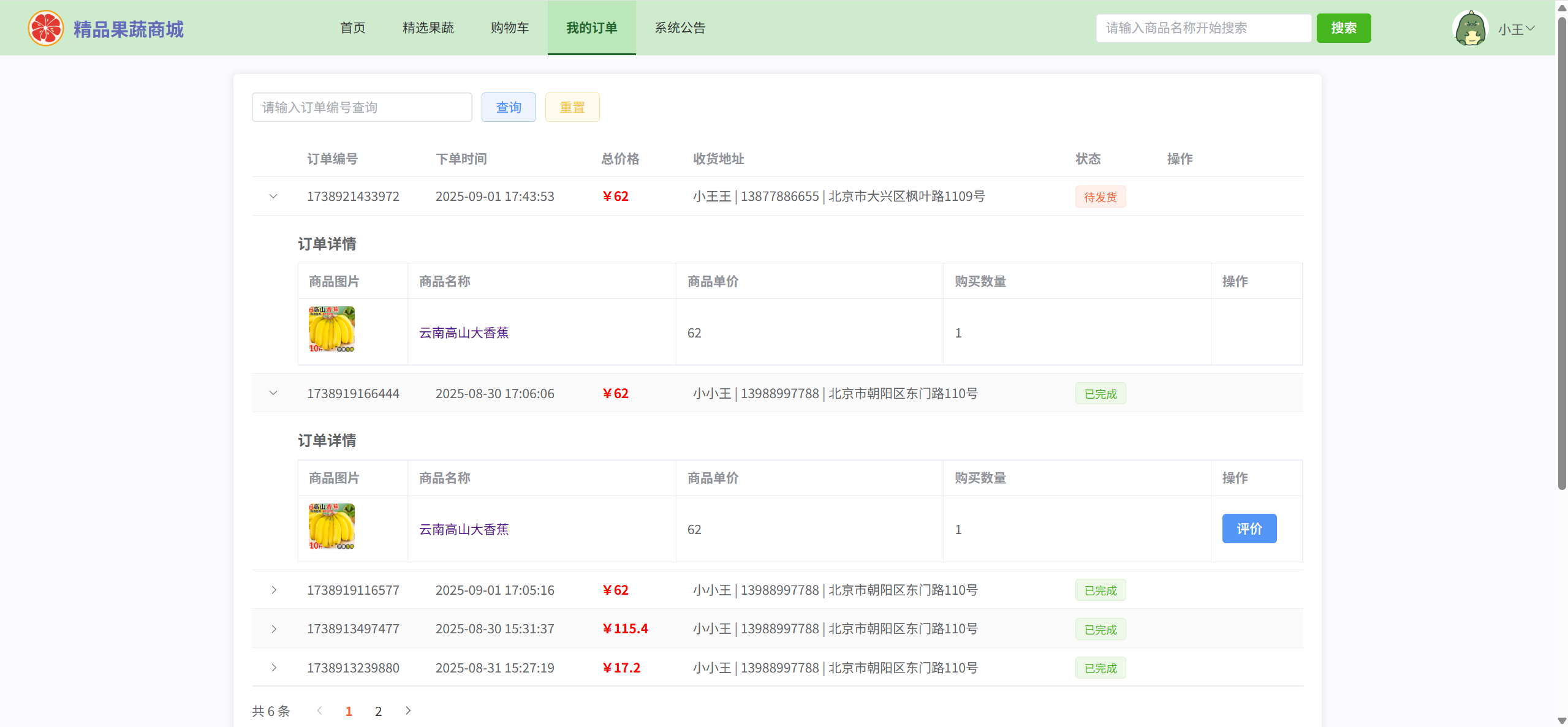我的订单:展示历史订单,用户可支付、取消订单、可以确认收货和评价商品