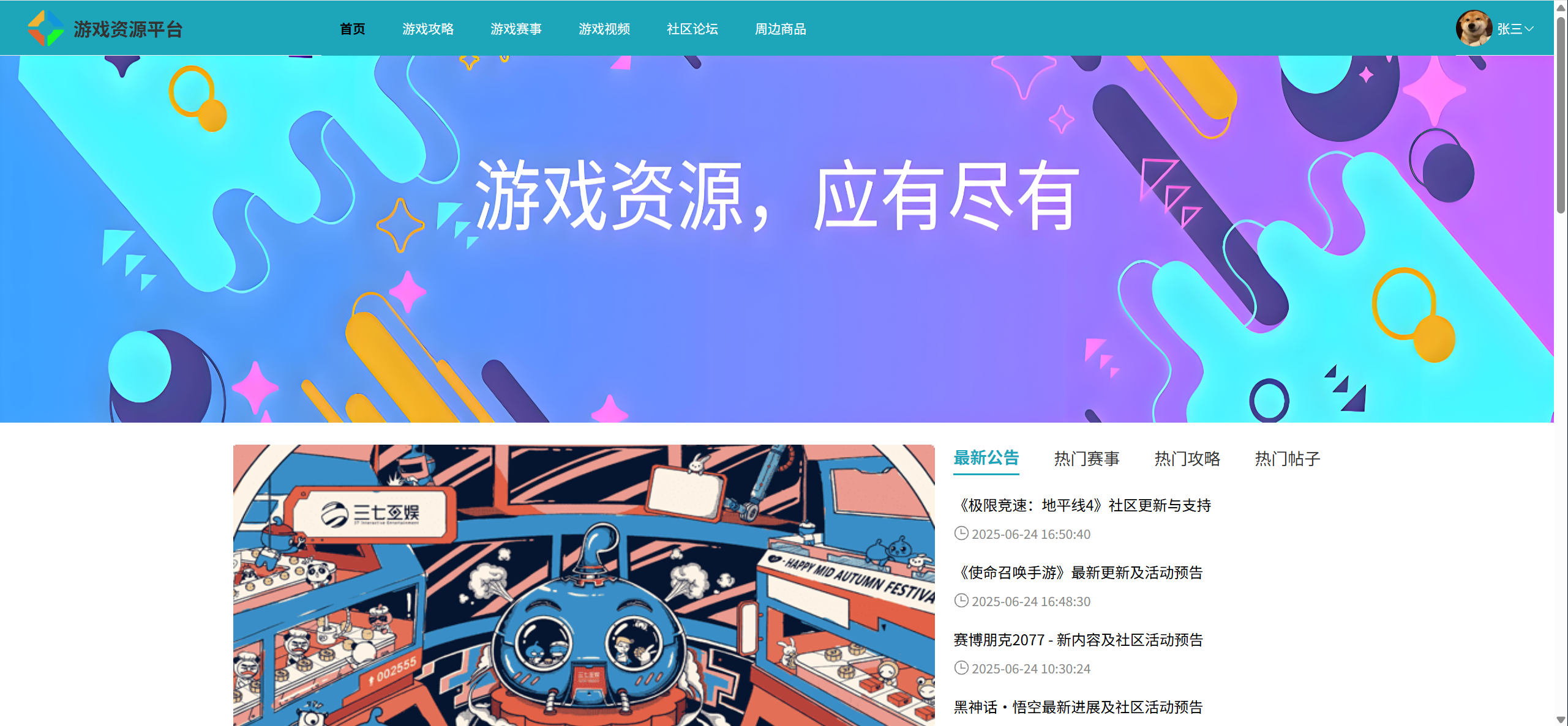 首页:上面一张长图,下面轮播图+公告+赛事+攻略+社区,热门视频,热销商品