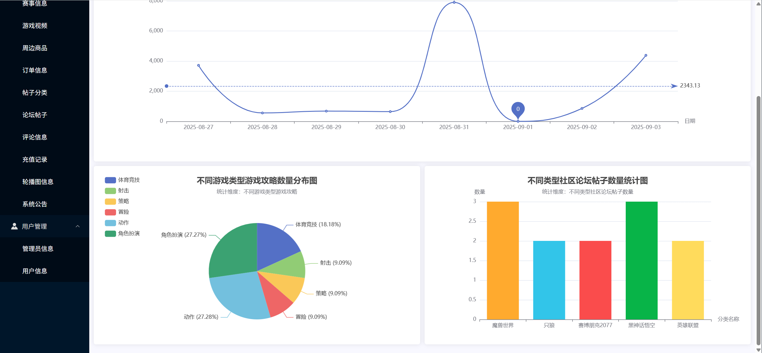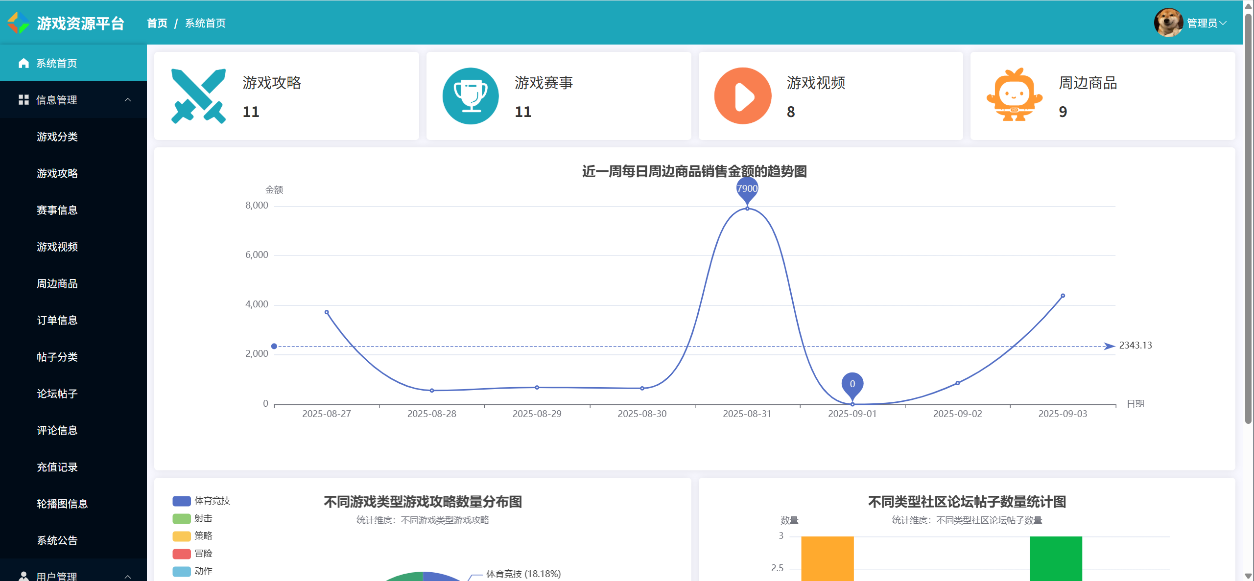 首页:统计近一周每日消费金额折线图,统计不同类型帖子饼状图,统计不同类型游戏攻略数量柱状图,统计赛事数量,帖子数量,攻略数量,订单数量