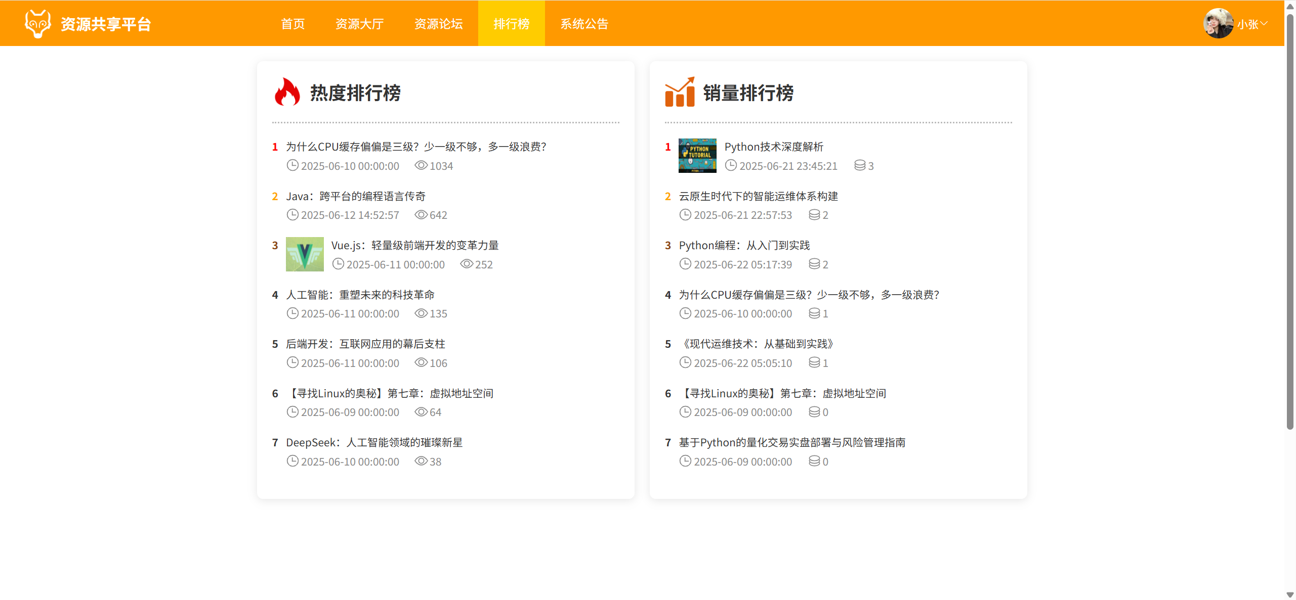 排行榜:按照浏览量和销量展示 2 种资源榜单
