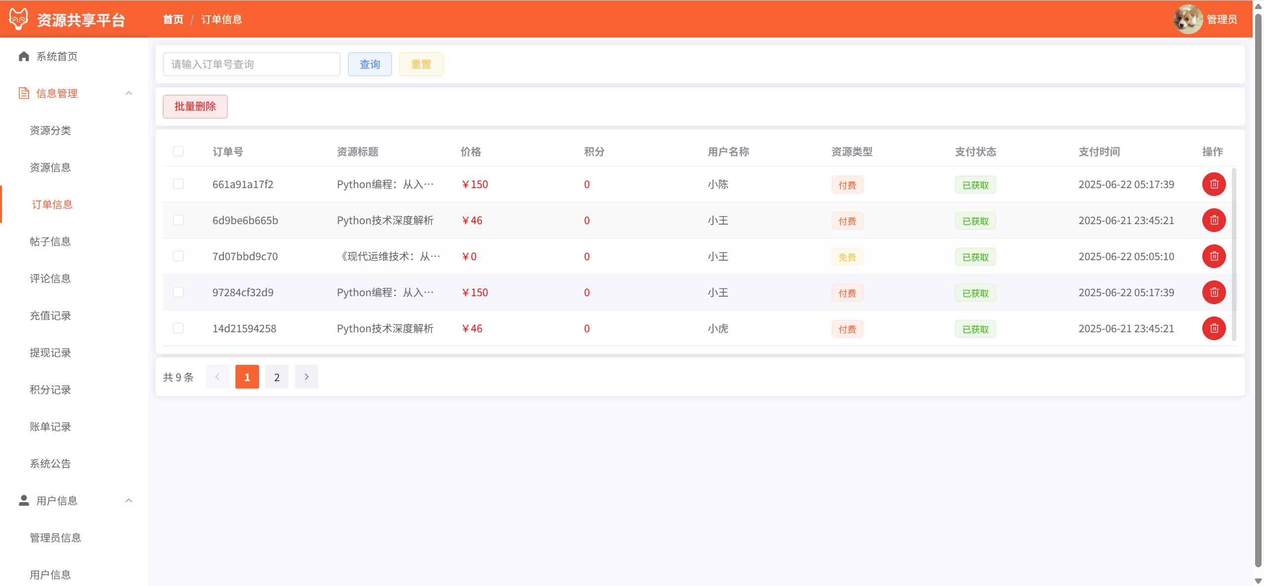 订单信息:管理用户获取资源的订单