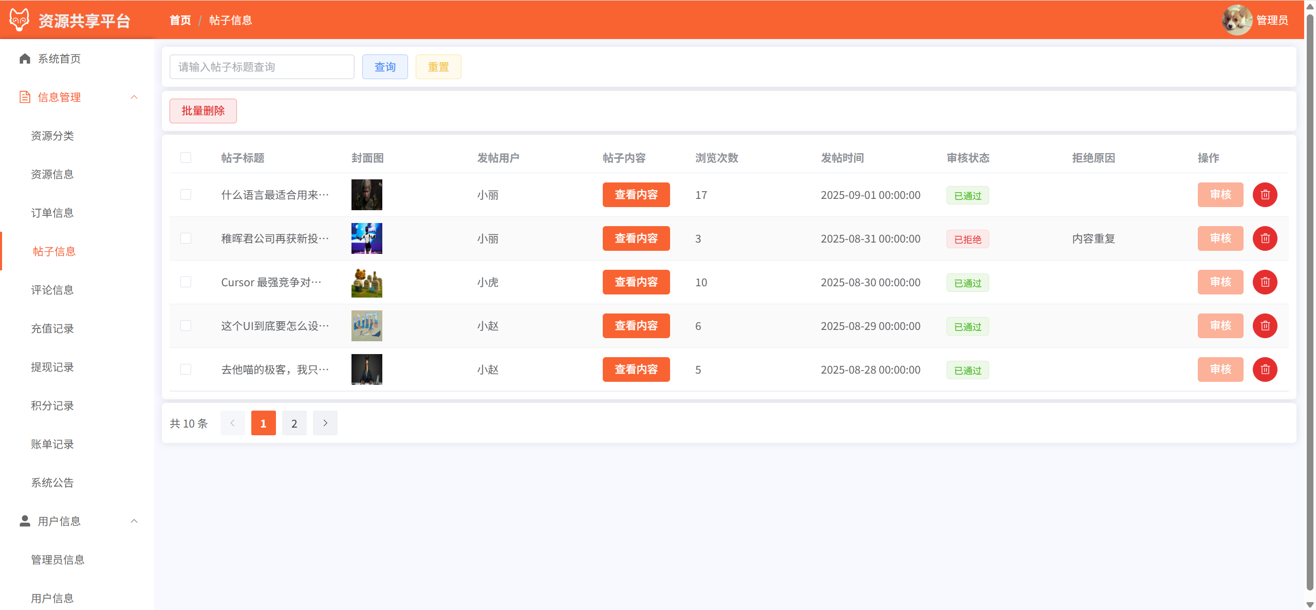 帖子信息:管理并审核用户发布的帖子信息