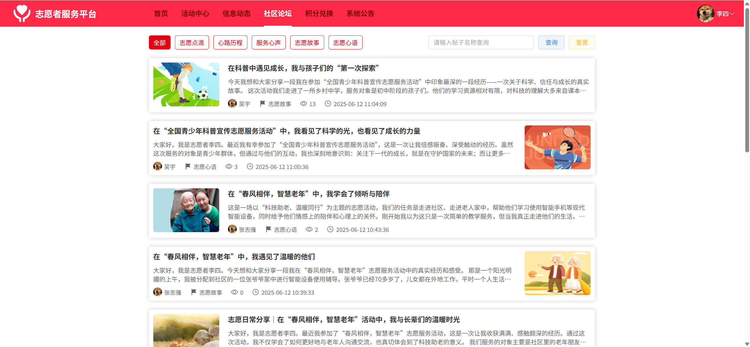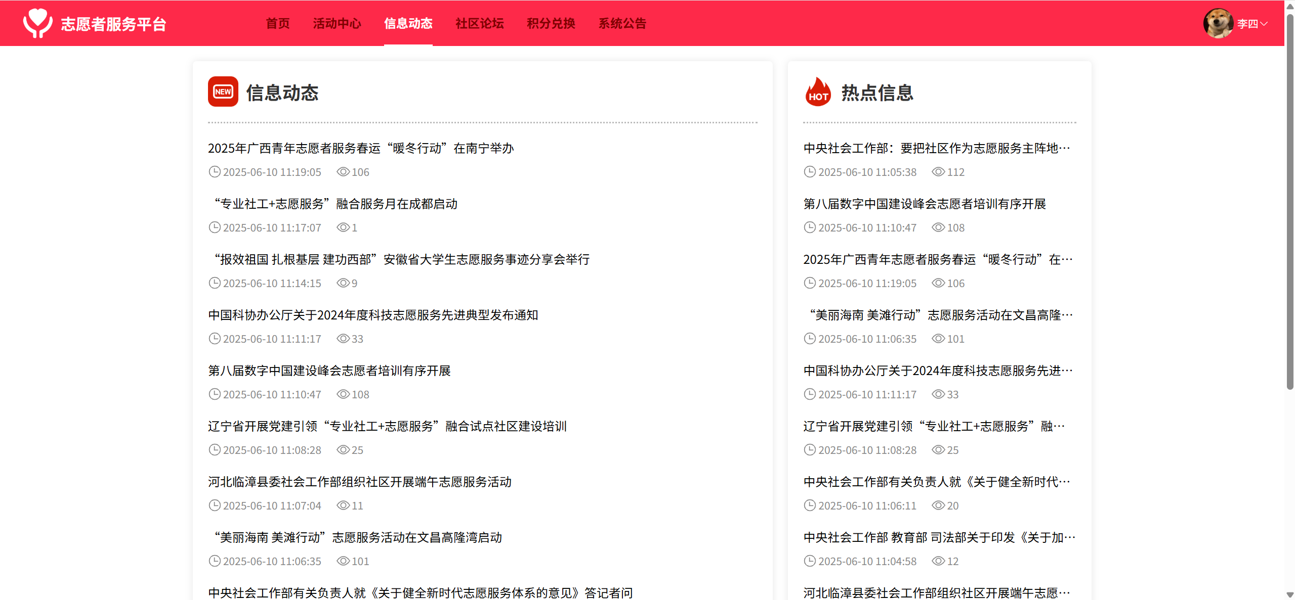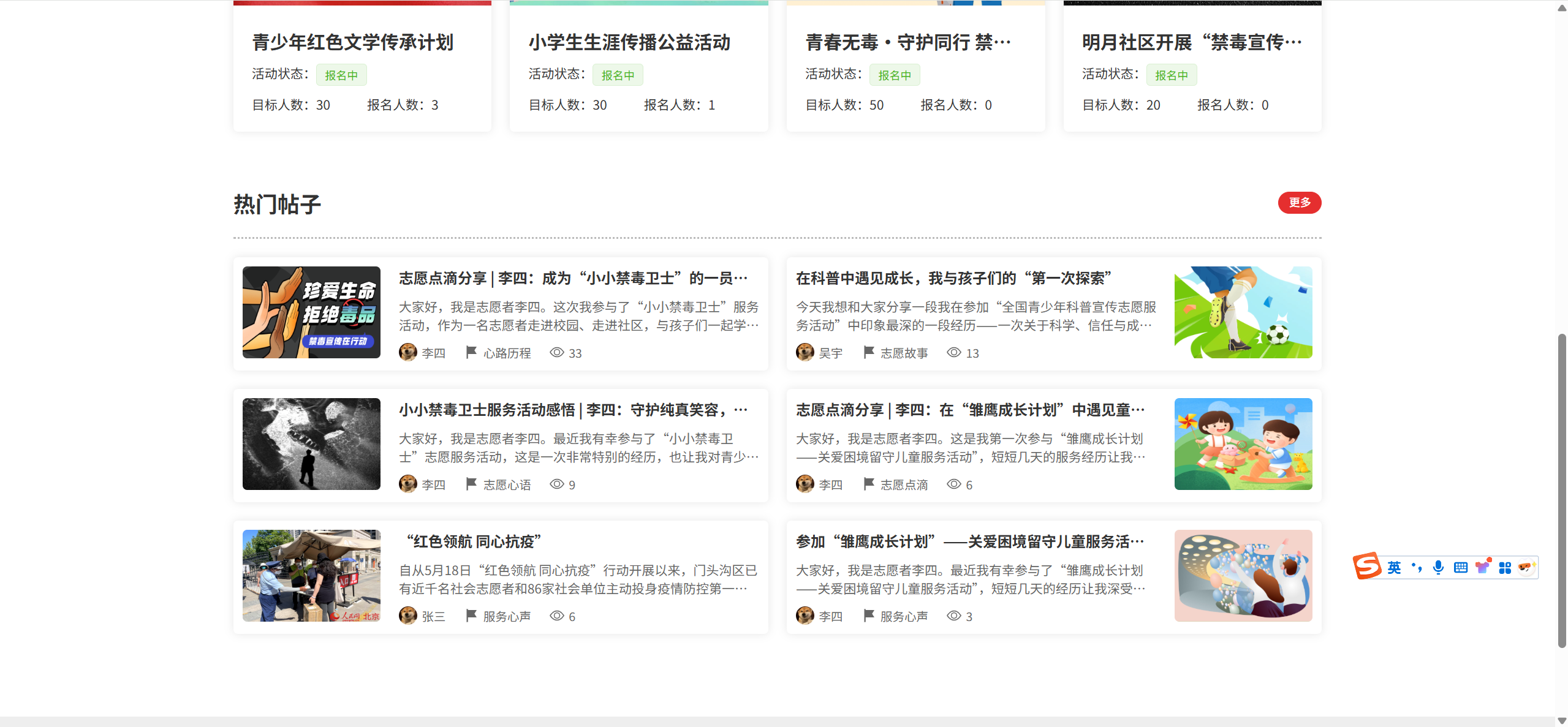 首页:查看轮播图、热点信息(浏览量最多的前五条信息动态)、最新志愿活动(最新发布的前4个活动)、热门帖子(浏览量最多的前六条帖子)