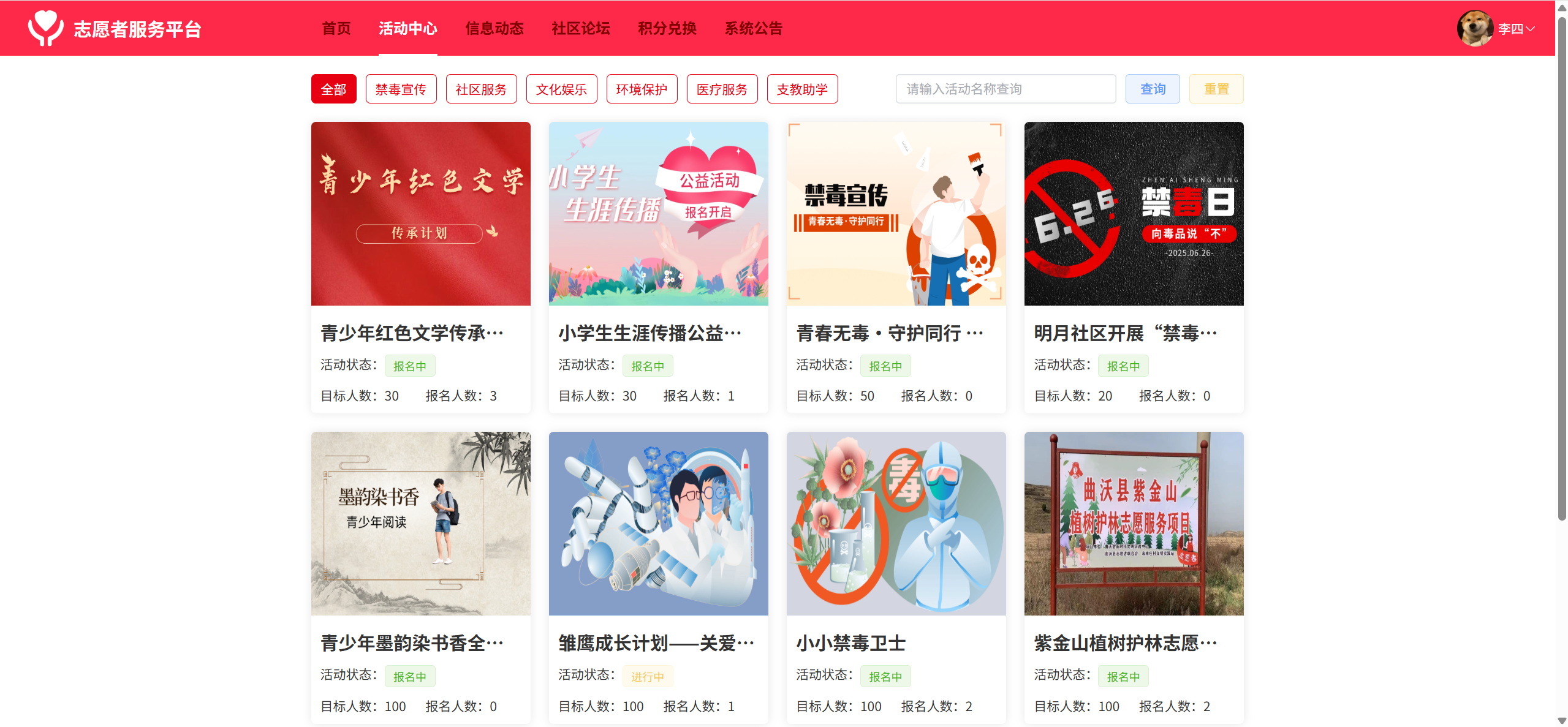 活动中心:查看所有志愿活动,可以按照活动类型和活动名称查询活动,点击可进入活动详情,可以查看评论、活动详情等信息