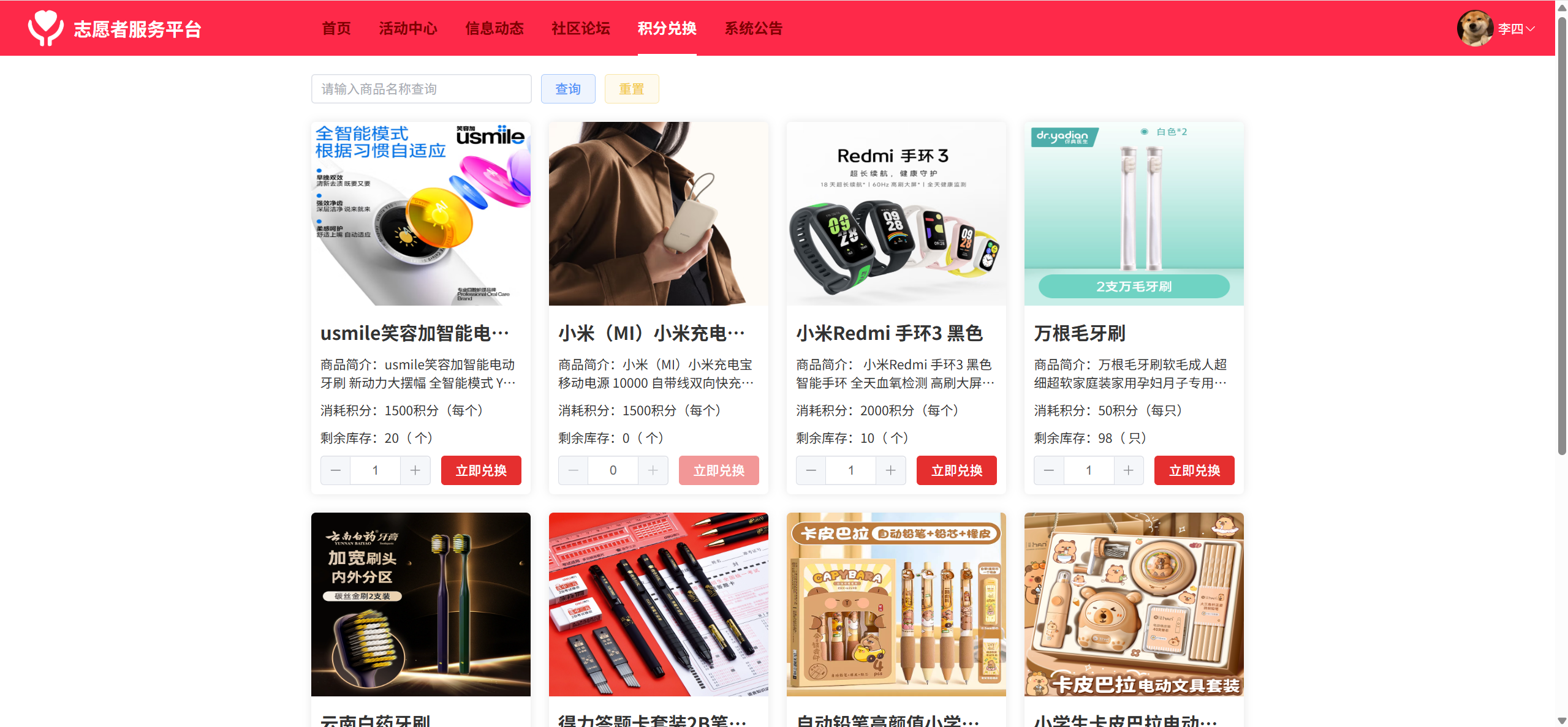 兑换订单:查看当前登录用户的所有积分兑换记录,管理员点击发货后,志愿者可点击签收