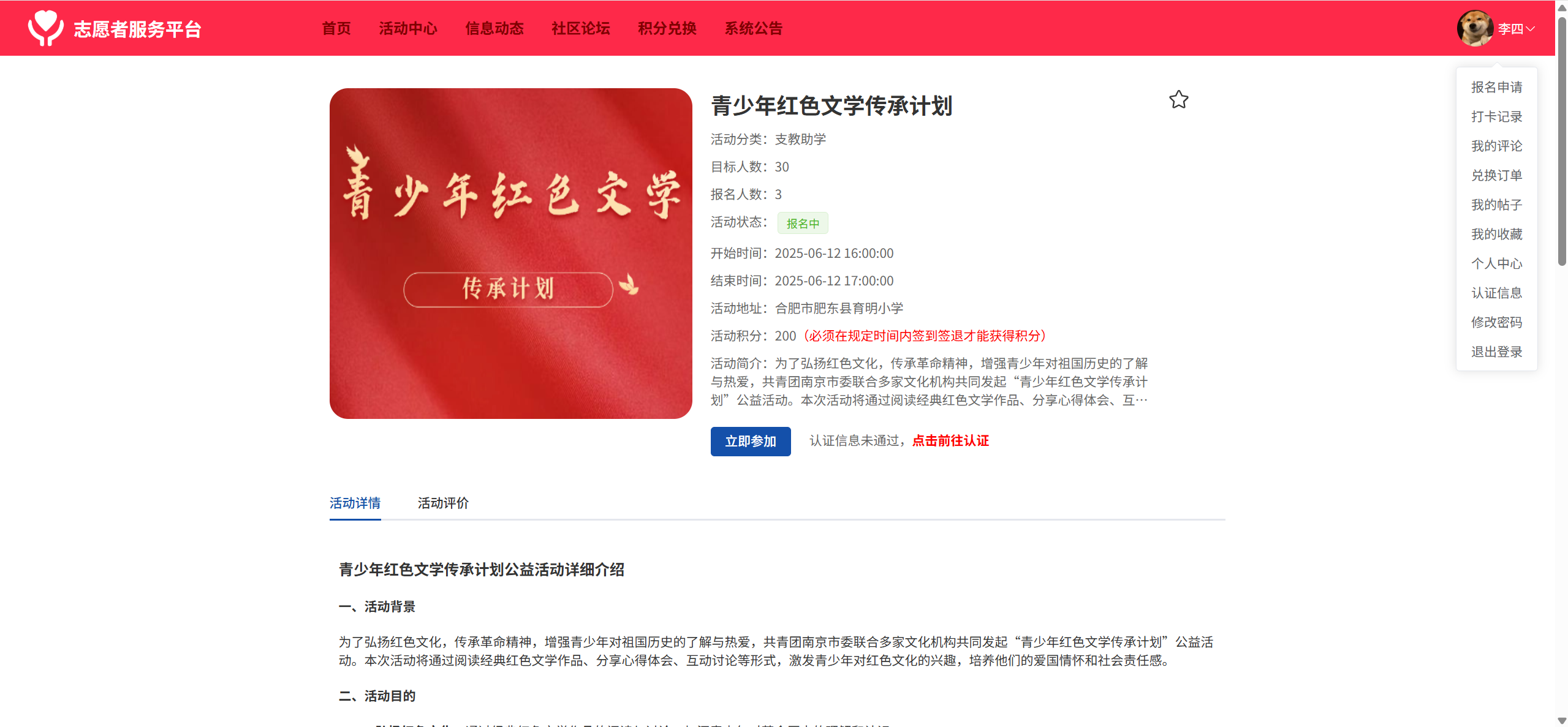 活动报名申请:志愿者认证信息通过后可以申请加入该活动,管理员审核申请,审核通过才能参加活动,审核拒绝必须填写拒绝理由。
