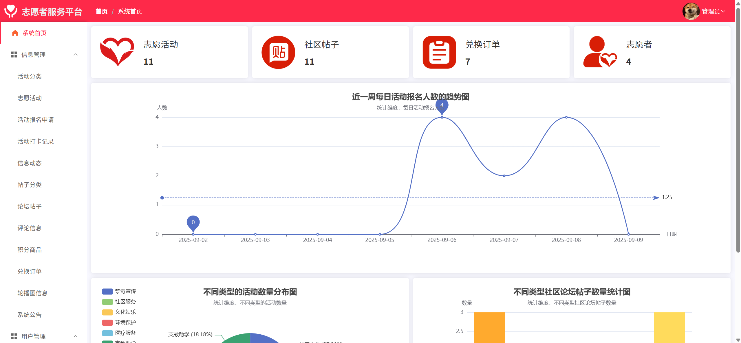 系统首页:查看系统统计数据,查看近一周每日志愿活动报名人数折线图、查看不同类型活动数量柱状图、查看不同类型社区帖子发布数量饼状图,统计志愿活动数量,社区帖子数量,兑换订单数量、志愿者数量