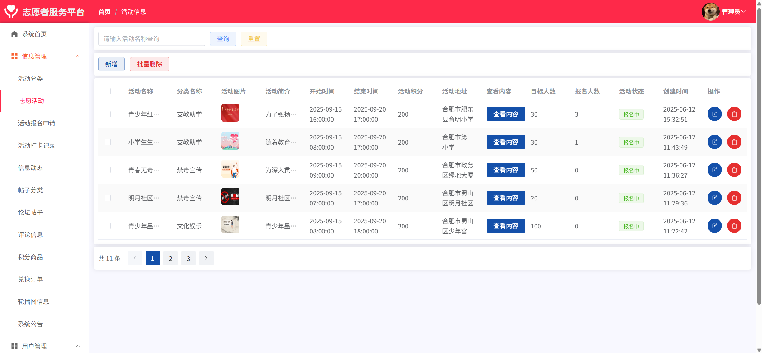 志愿活动:管理志愿活动,如设置活动的开始时间,结束时间,活动地址、活动状态、目标人数和选择活动分类等信息