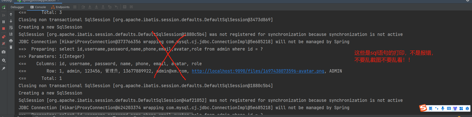 这个是最频繁的问题,大家一定谨记,报500或者报系统异常了,那一定是后台Java代码报错了,这时候你需要做的是,第一时间去后台控制台那边看下报了什么错,有些小伙伴不知道控制台里哪些才是报错,截图的五花八门,一般控制台那边,error开头的都是报错,其他不是,例如:
