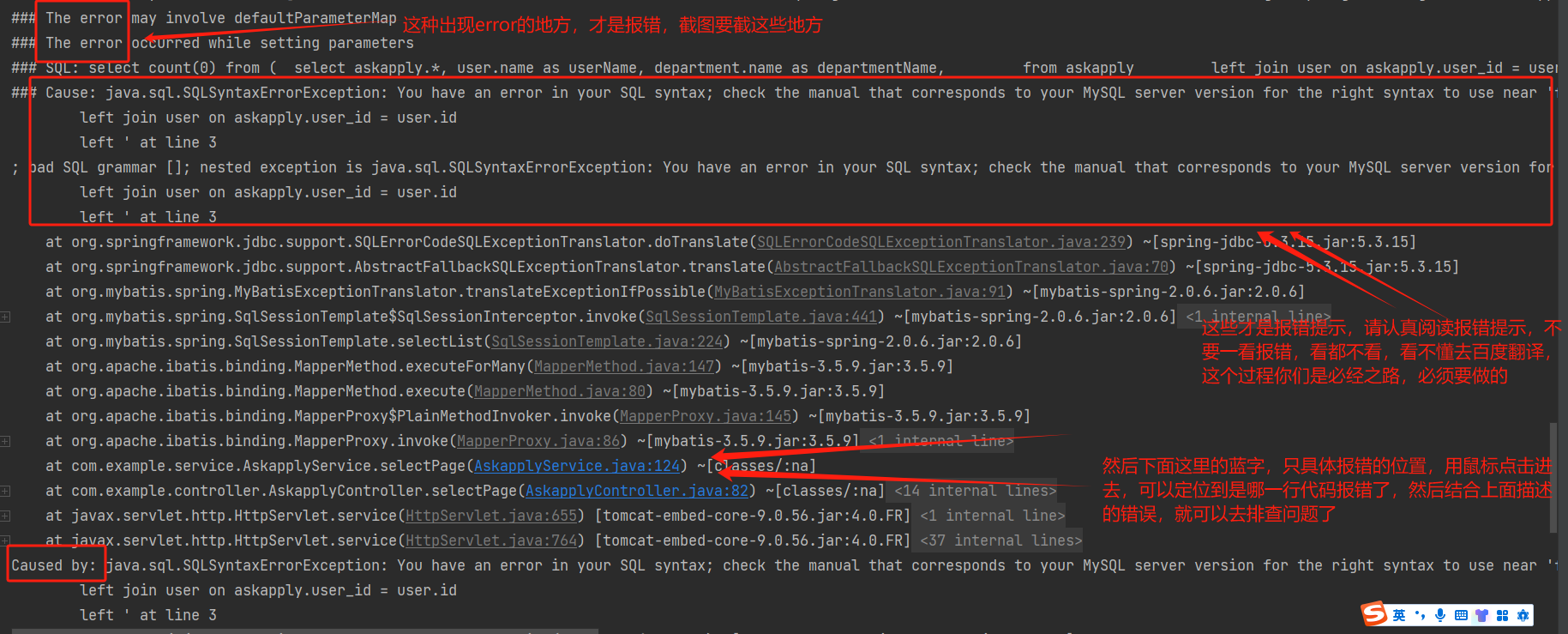 上面那个一看就是sql语句写的有点问题,有些是空指针异常(NullPointException),你们也要定位到对应的那一行,然后在该行打个断点,走到这里,看看到底哪个变量是null,然后再去排查为什么过来的是null,从controller接口入口一步步过来看看哪里出问题了。
