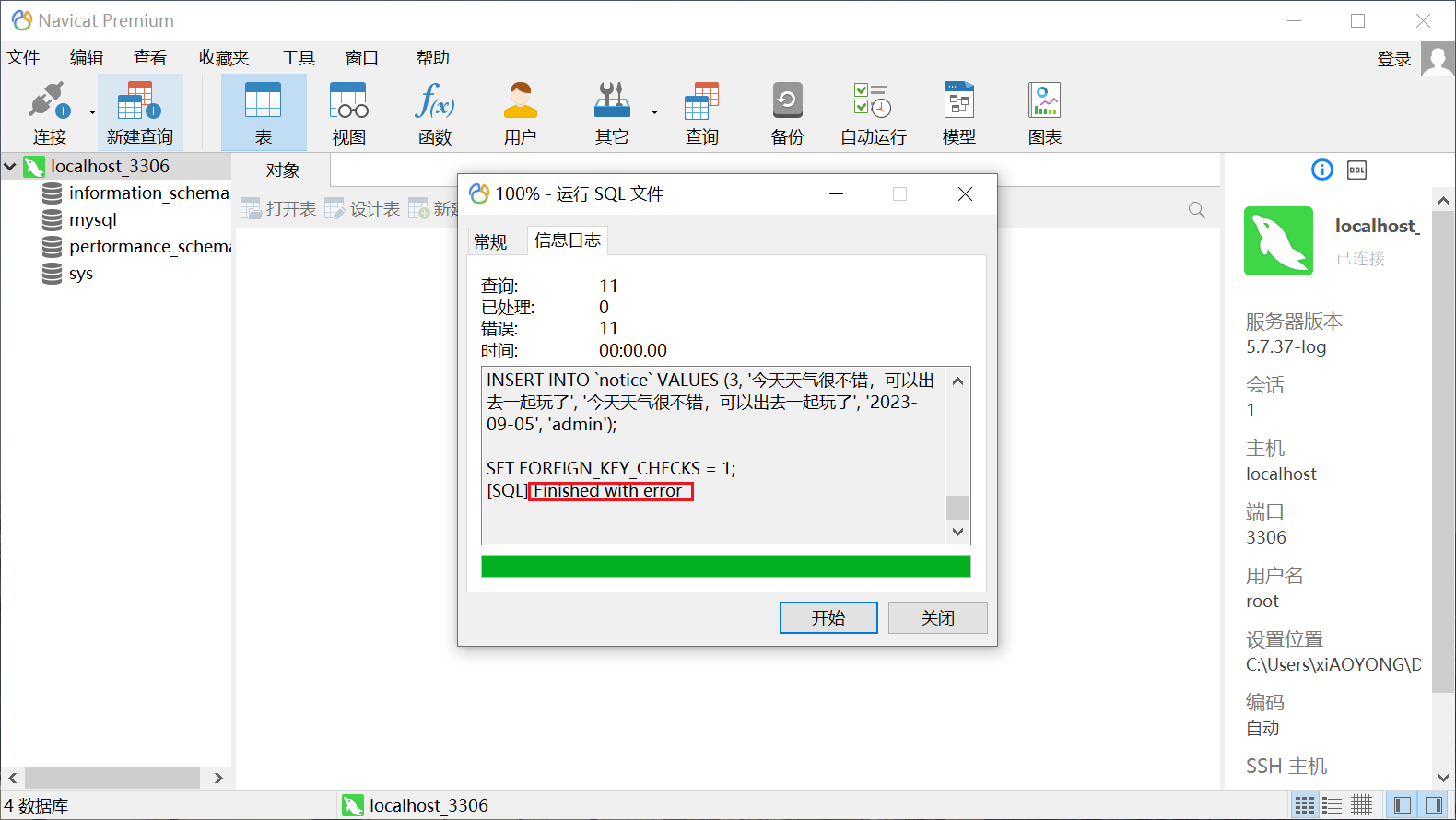 这种问题啊,你首先得拉到最上面看下报错,请不要再这样贴个图了,没人知道。但是星球里,出现这个问题的大概率原因,是你数据库没创建,不信你拉上去看看就知道了。所以要先创建一个数据库,再在这个数据库上面右键->导入。