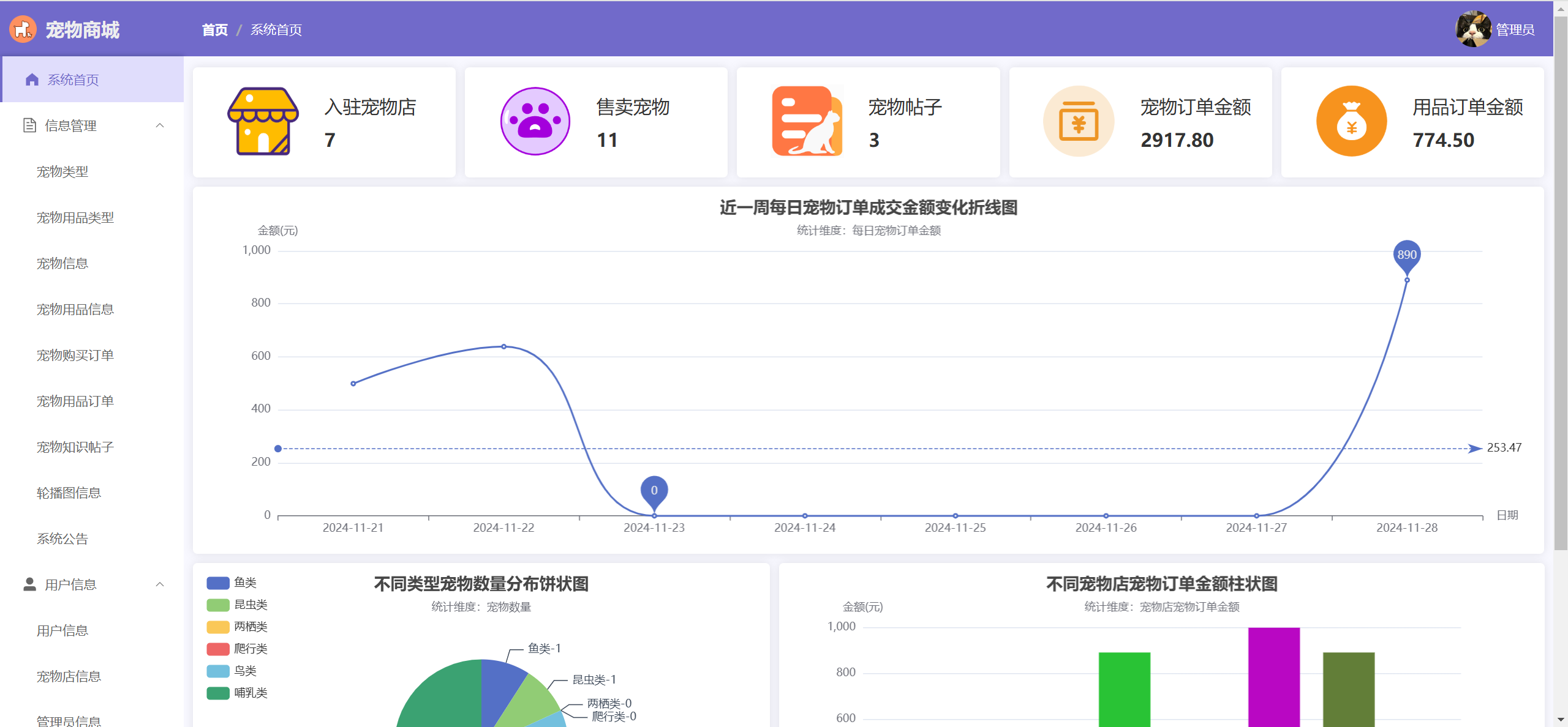 系统首页:统计所有宠物销售数据以及宠物店、宠物数量等
