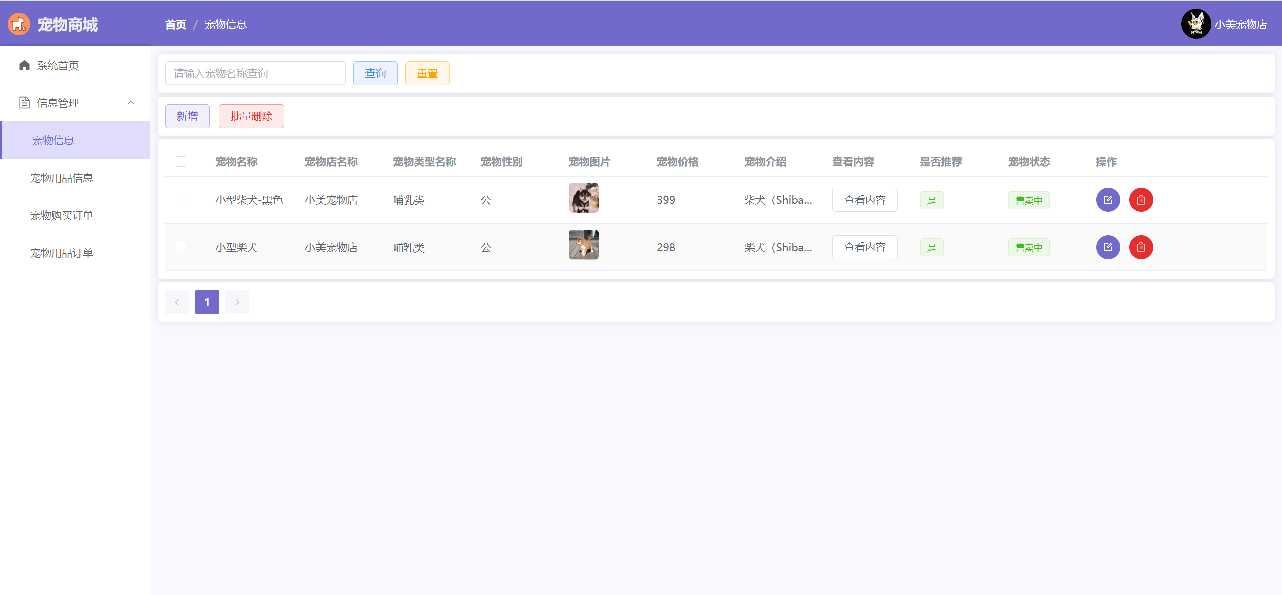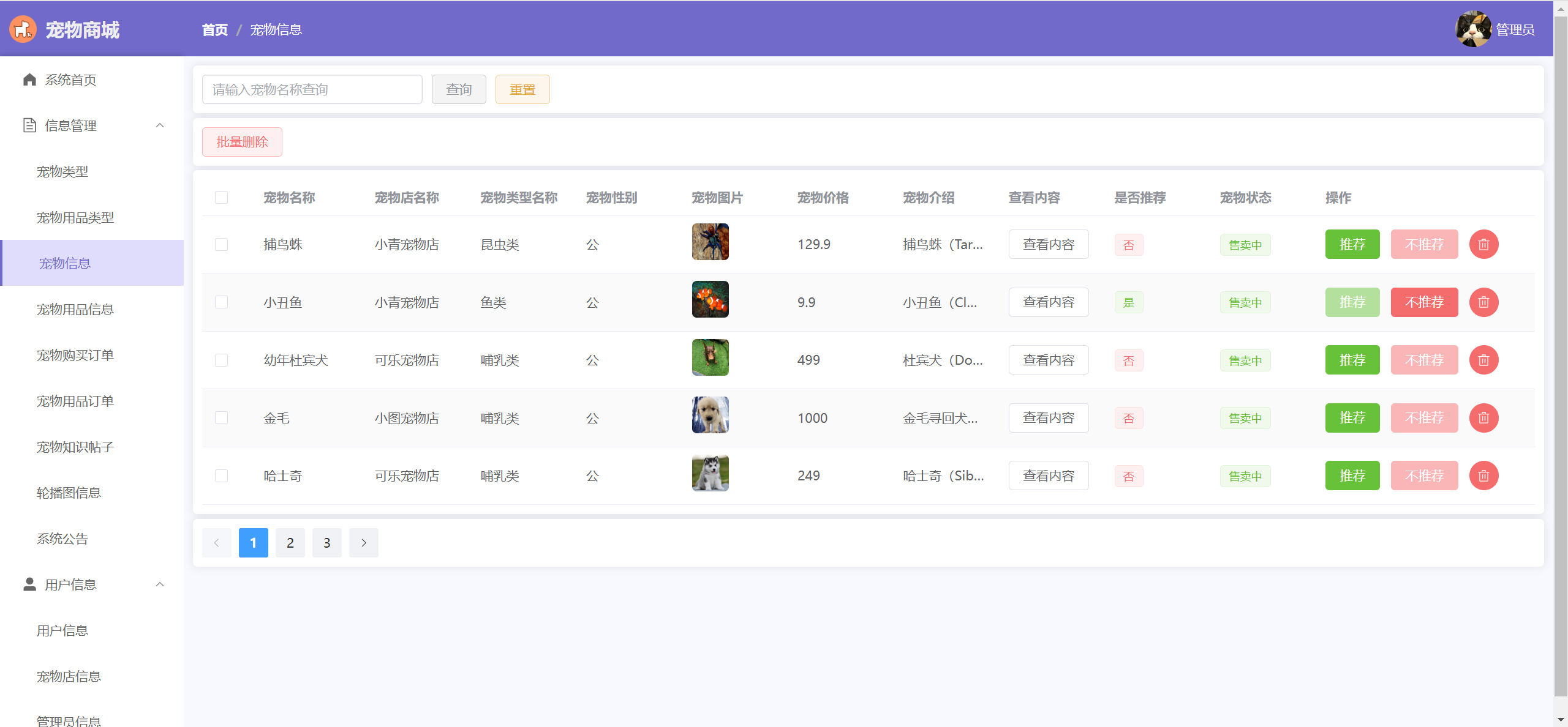 宠物信息:管理所有由宠物店上传的宠物信息,并且可以设置宠物是否进行推荐,推荐的宠物可以在首页进行展示