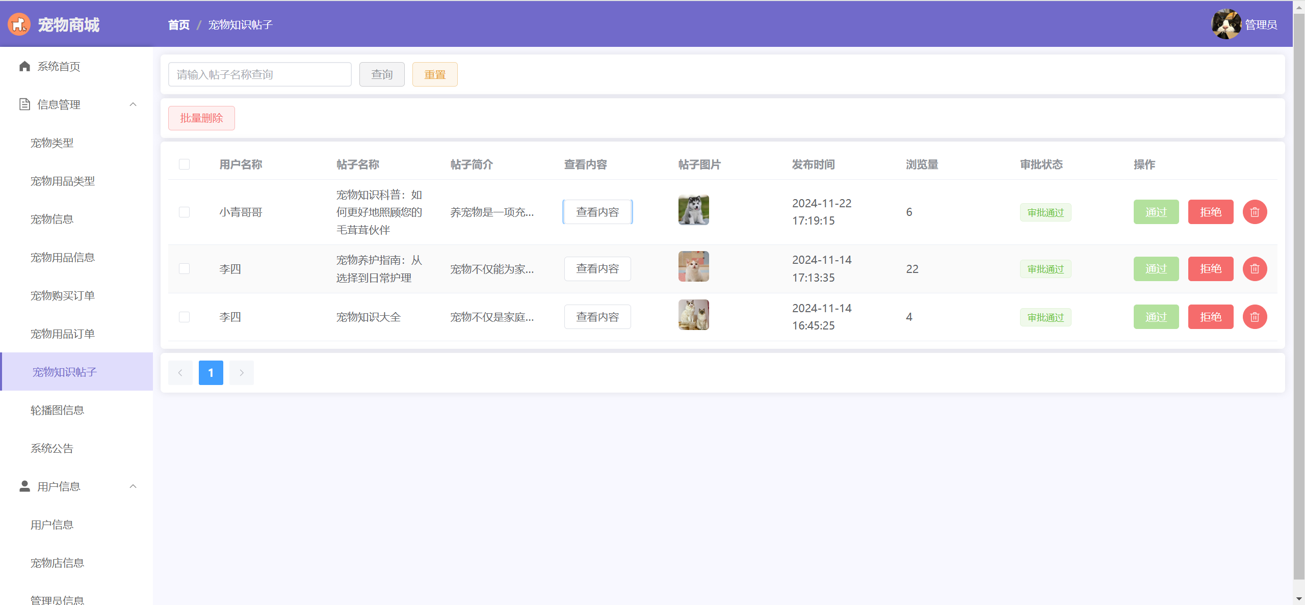 宠物知识帖子:管理所有由用户发布的宠物知识帖子信息,所有管理员审批通过的帖子才可以被其他用户看到,待审批和审批拒绝的不能被其他用户看到