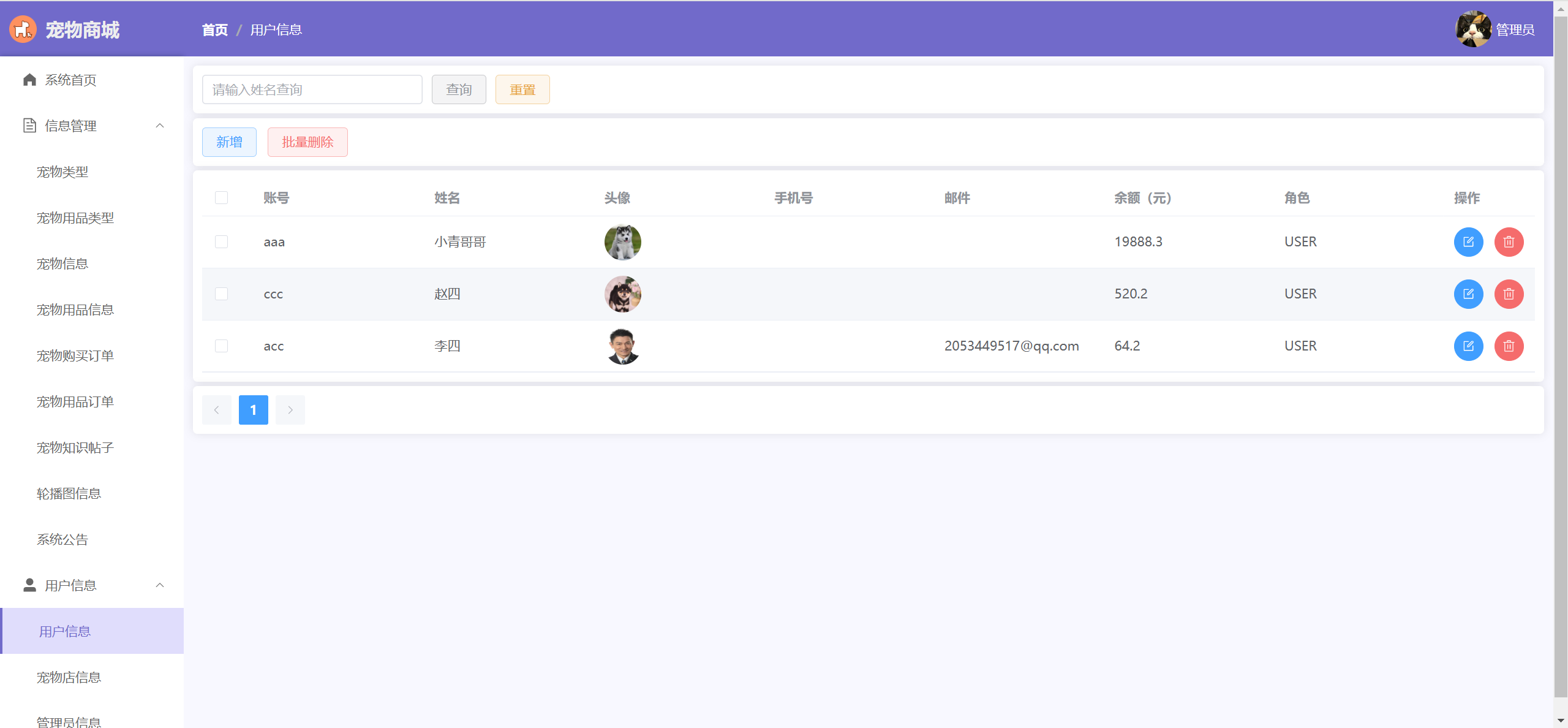 宠物店信息:管理所有宠物店信息,宠物店在注册完成后,需要上传认证信息后,由管理员进行审批通过后才能使用宠物店的功能
