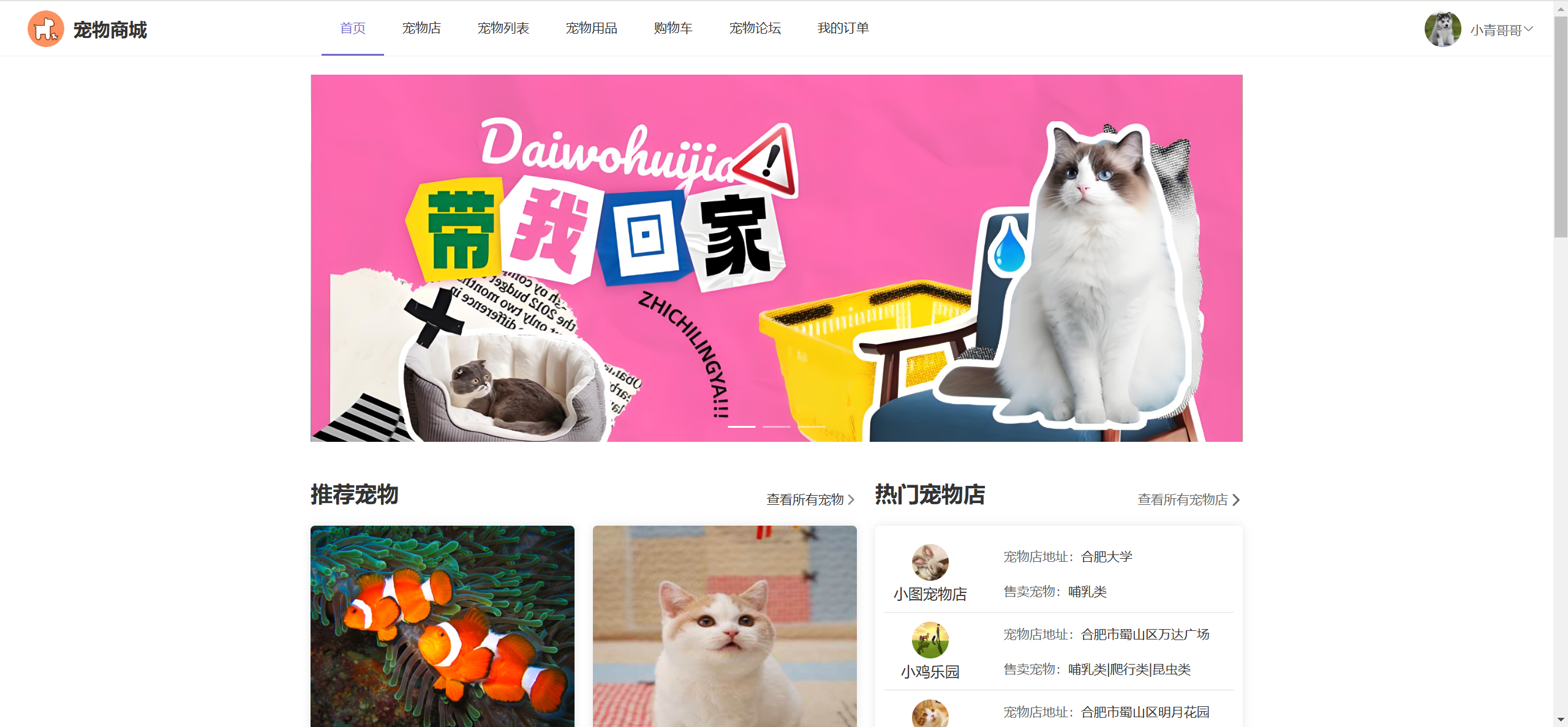 首页:查看轮播图、推荐宠物、热门宠物店、热销宠物用品等信息