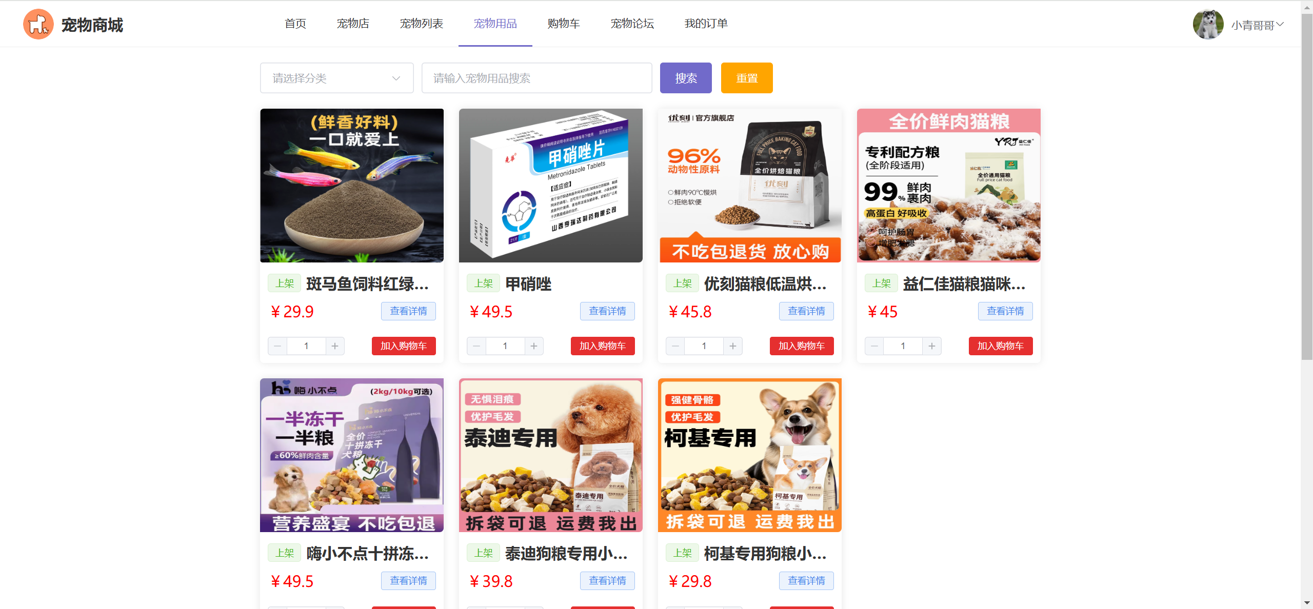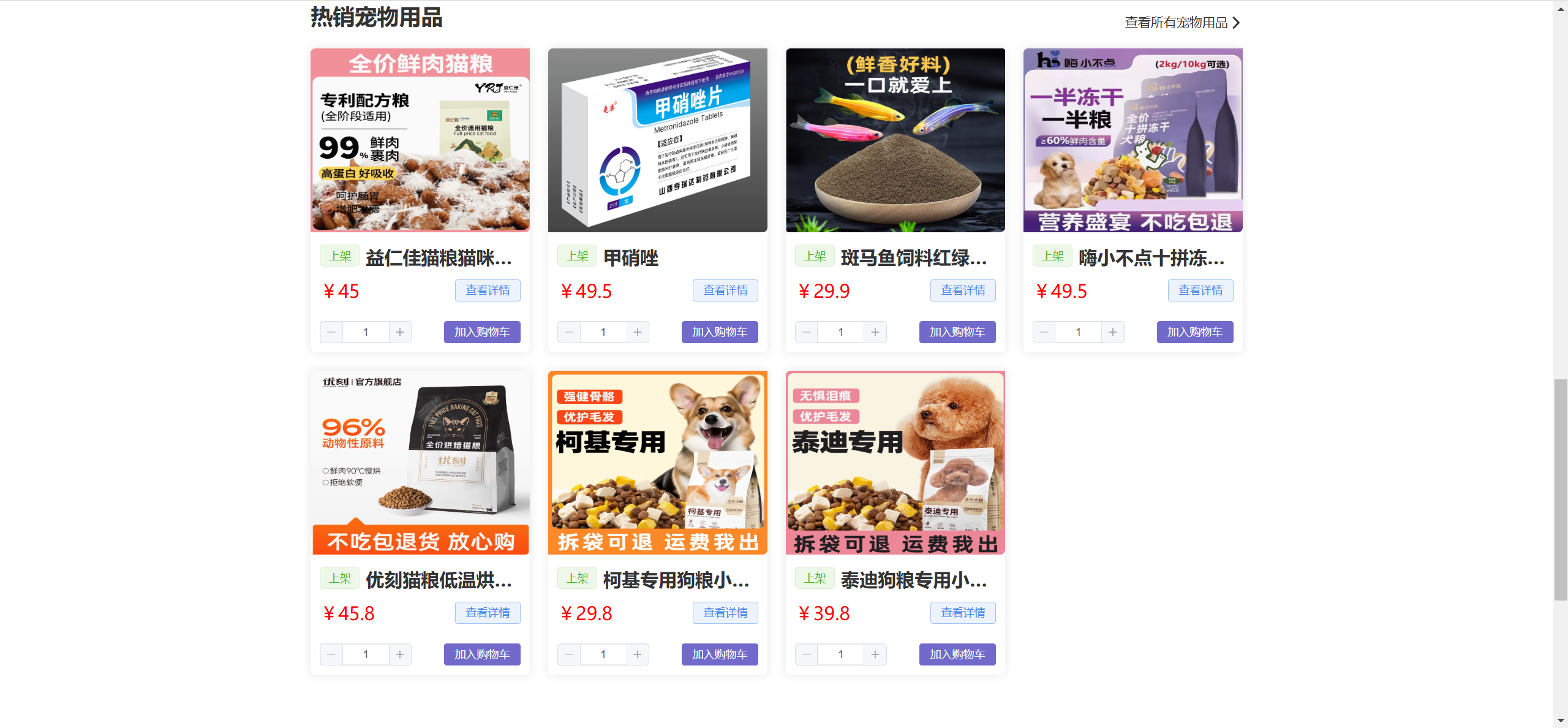 宠物用品:查看所有宠物用品信息并且可以输入用品数量后加入购物车,已加入购物车的商品将会在原本的基础上加上新加入的用品数量