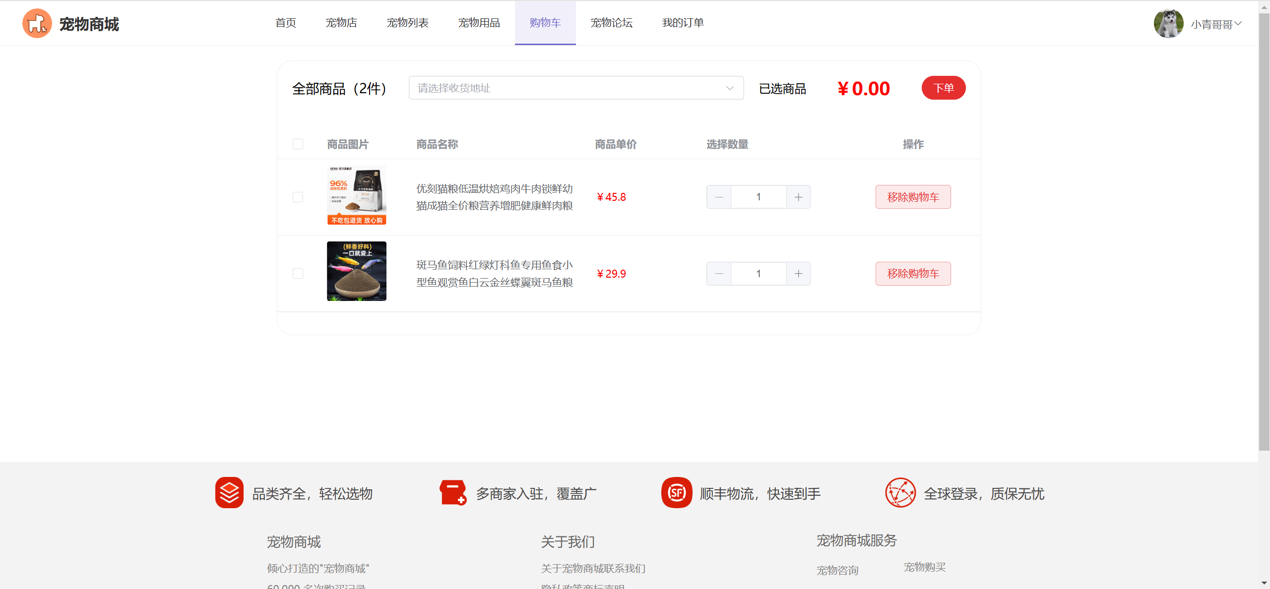 购物车:可以选择用户自己的购物车商品进行下单,会自动计算总价格,并且下单前需要选择收货地址