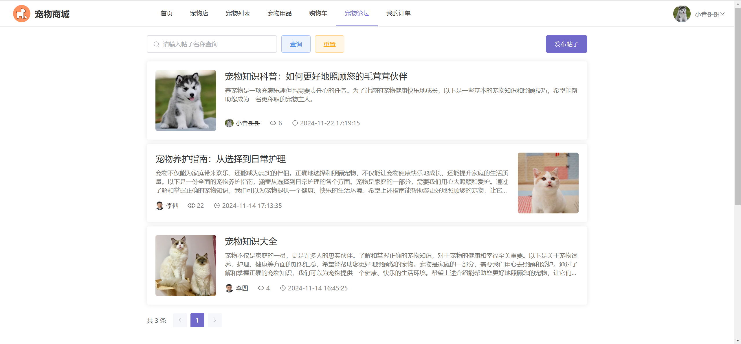 宠物论坛:用户可以查看所有已经通过审批的宠物知识帖子,也可以在这里发布宠物知识帖子