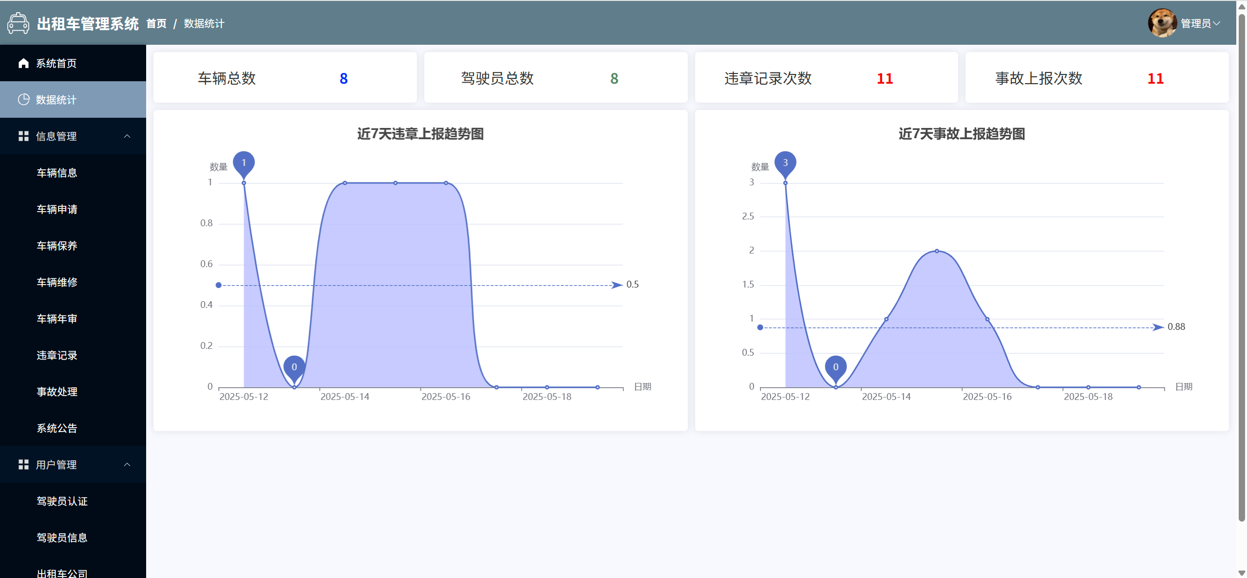 数据统计:查看车辆数据、驾驶员数据、违章数据、事故上报数据,统计近 7 天内的违章和事故次数