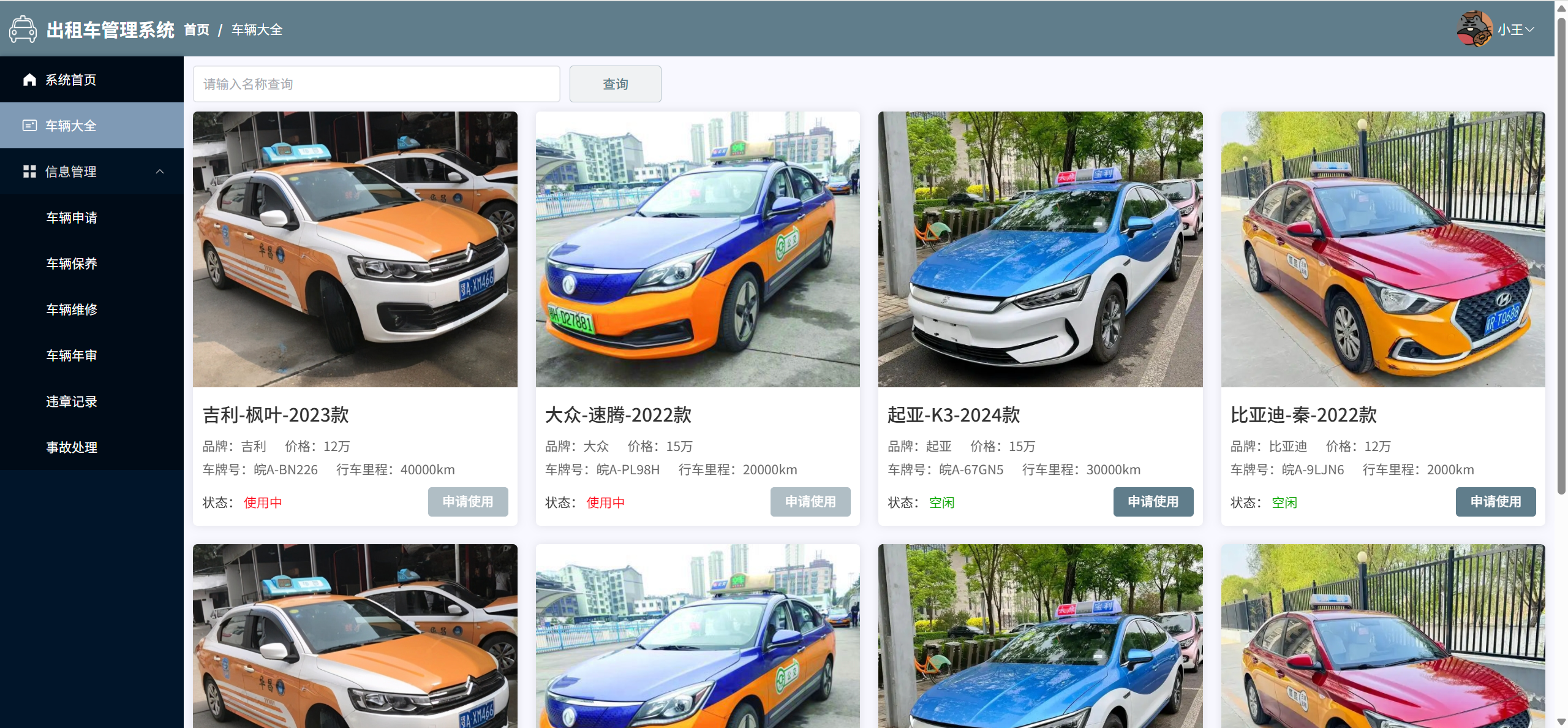 车辆大全:查看所有车辆信息,可申请使用车辆