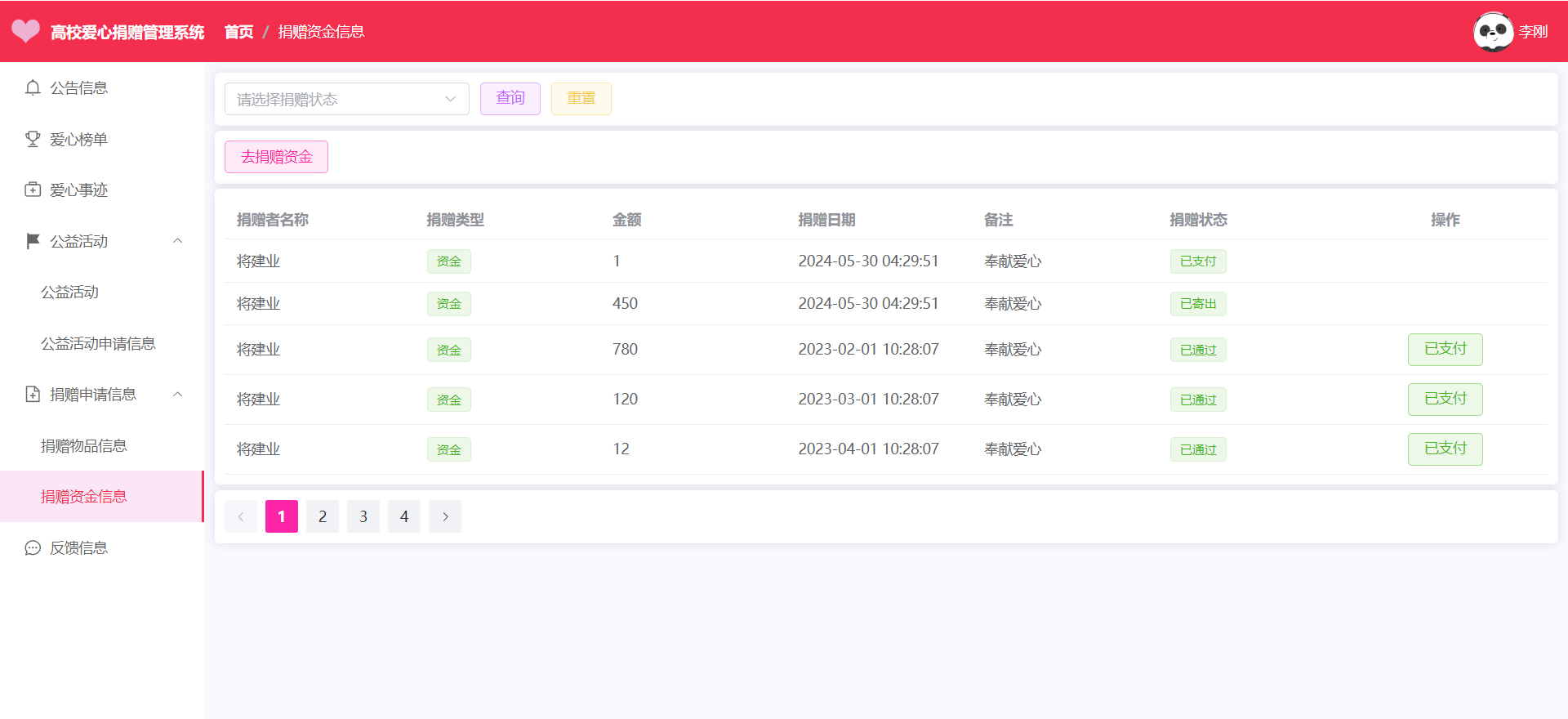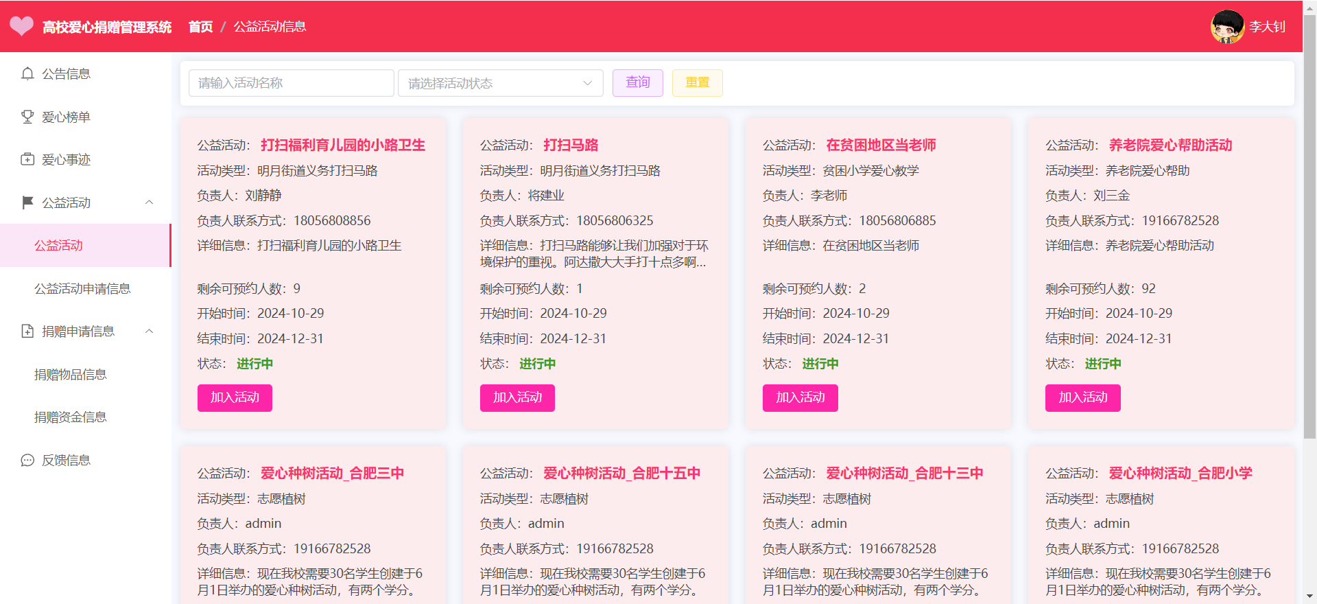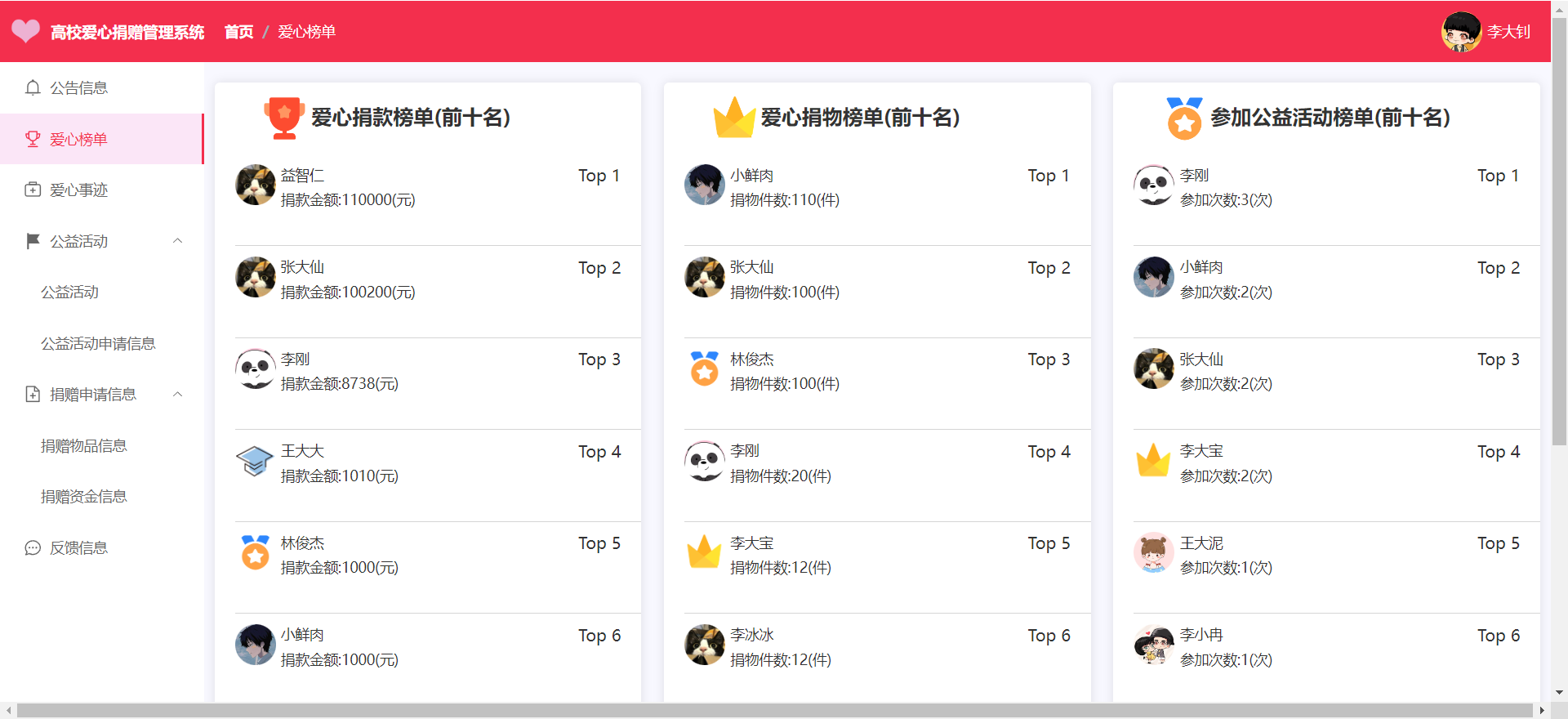 爱心榜单:查看根据捐赠物品、物资或者参加活动次数由系统评选出来的爱心榜单