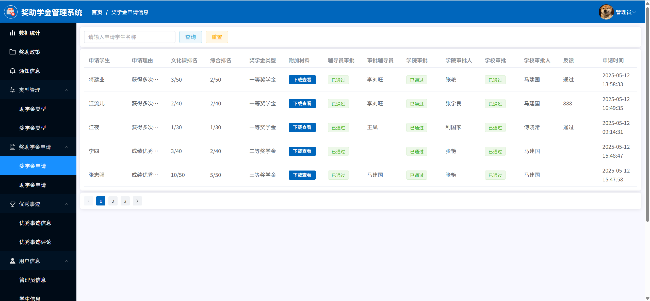 奖学金申请信息:查看由学生提交学校审批的奖学金申请