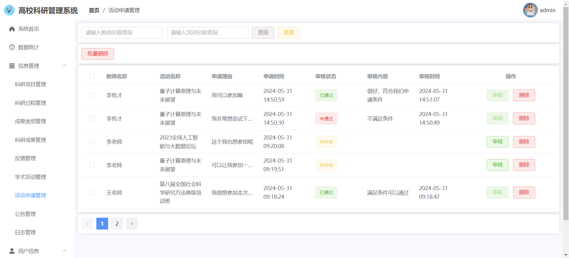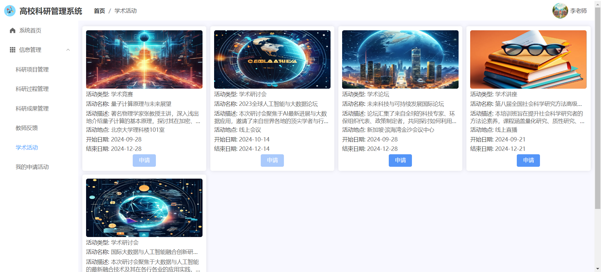 学术活动:查看管理员发布的学生活动信息、提交申请