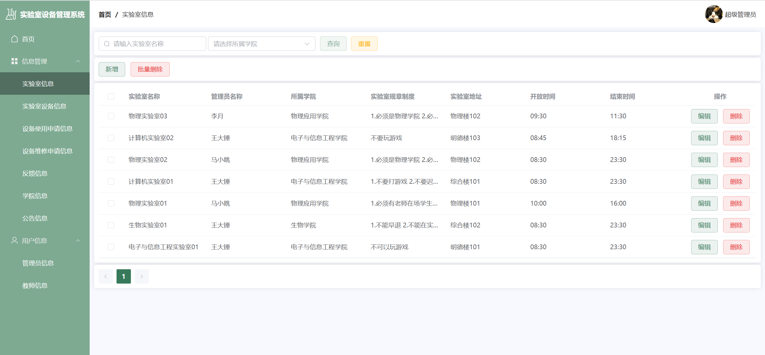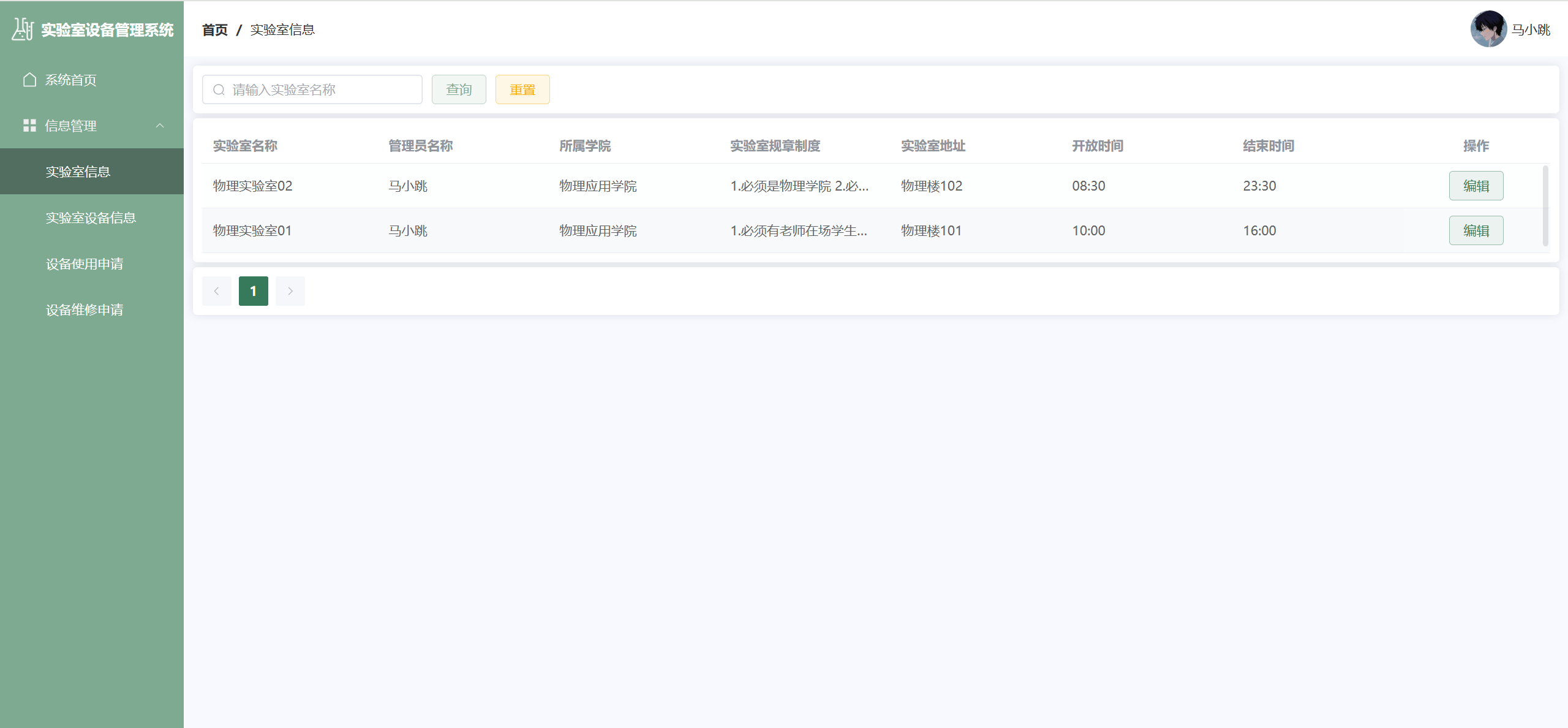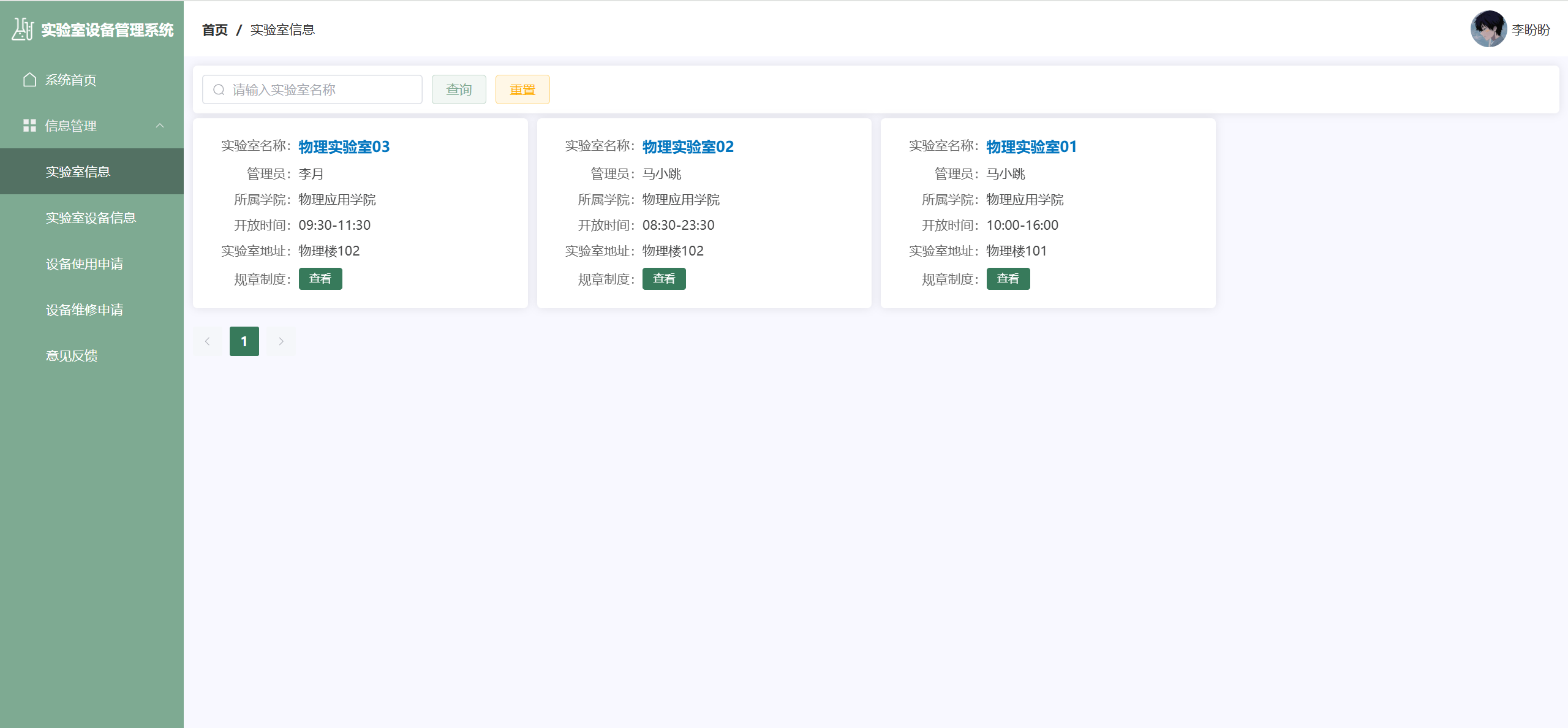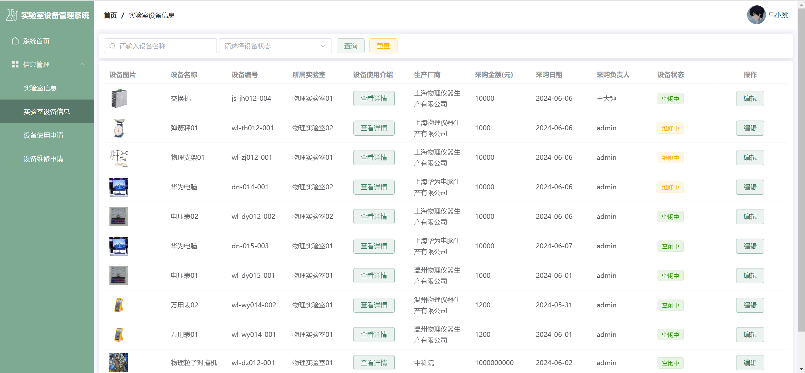 实验室设备信息:查看和申请使用本学院所有实验室的设备信息