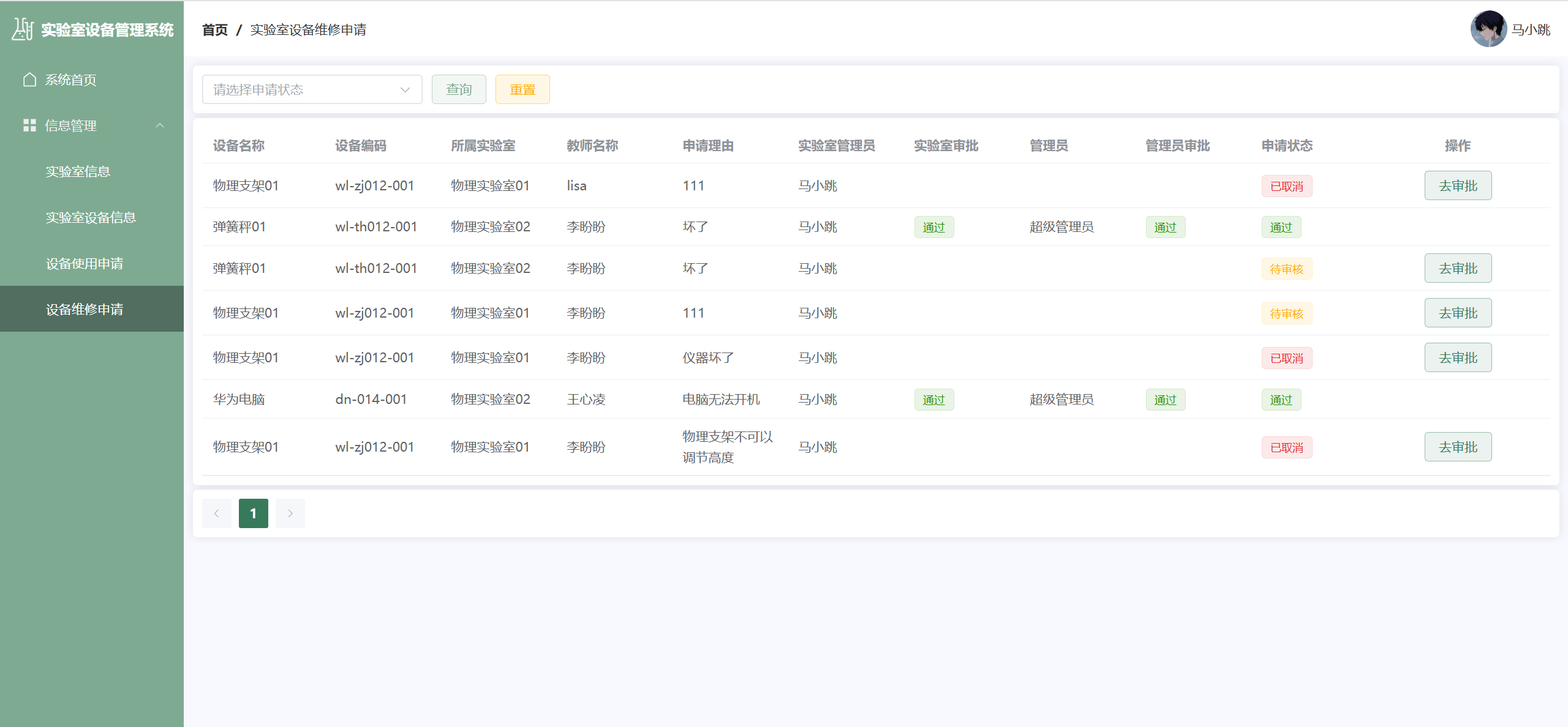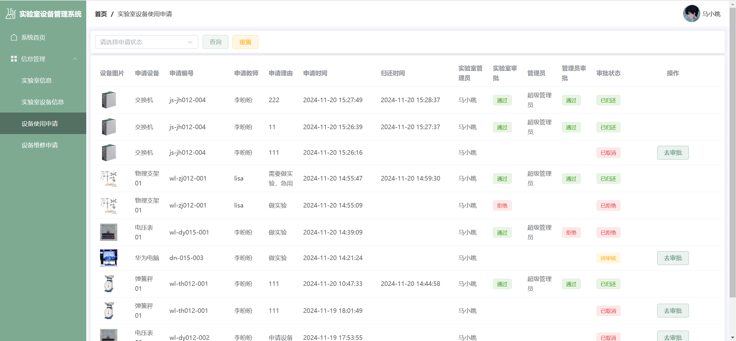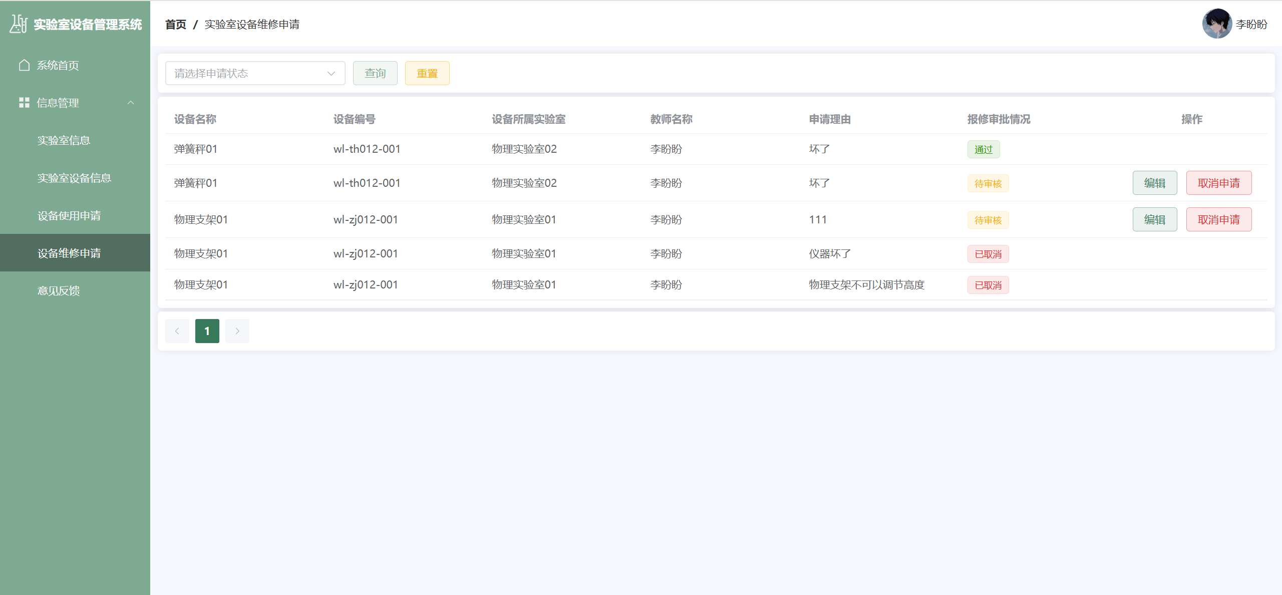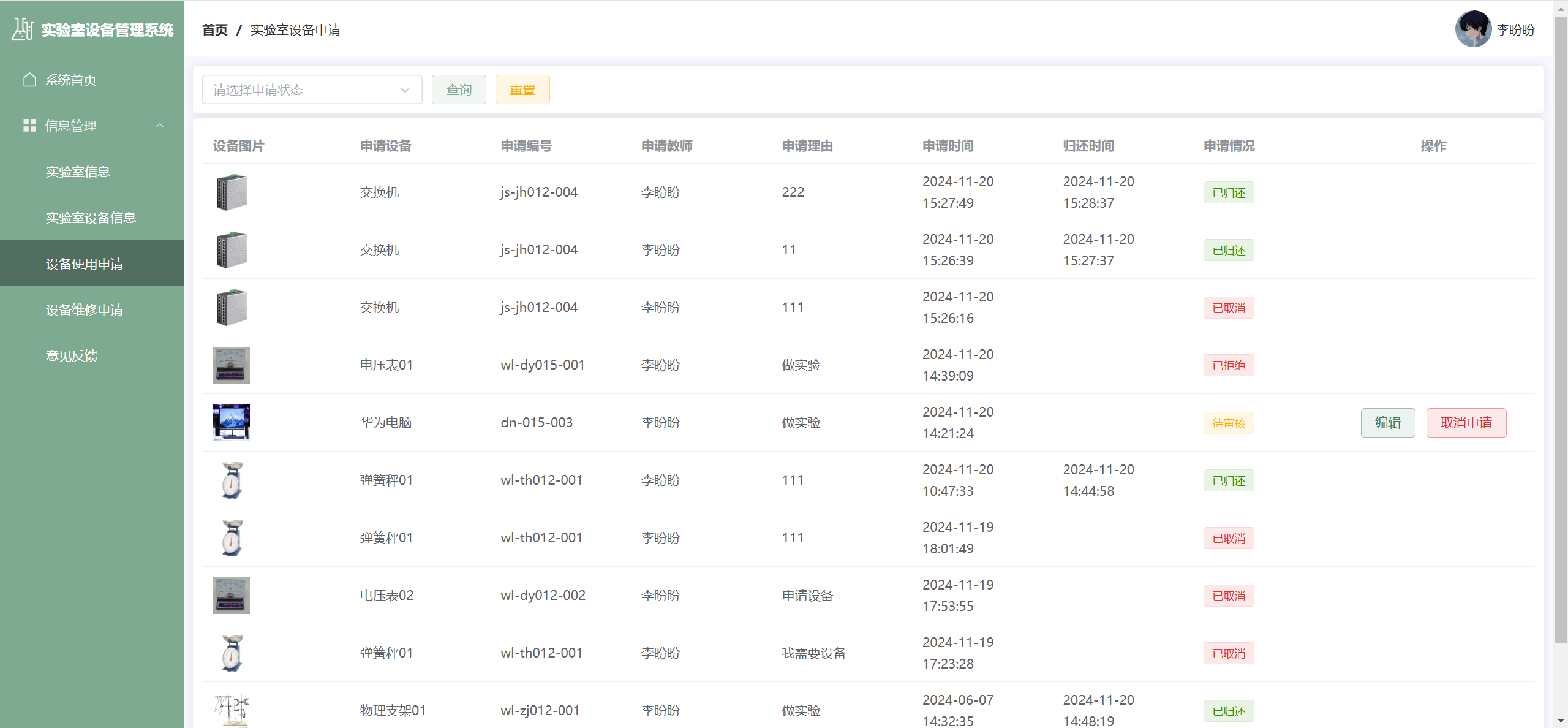 设备使用申请:查看和编辑自己使用设备的申请,还可以对正在使用的设备进行维修申请
