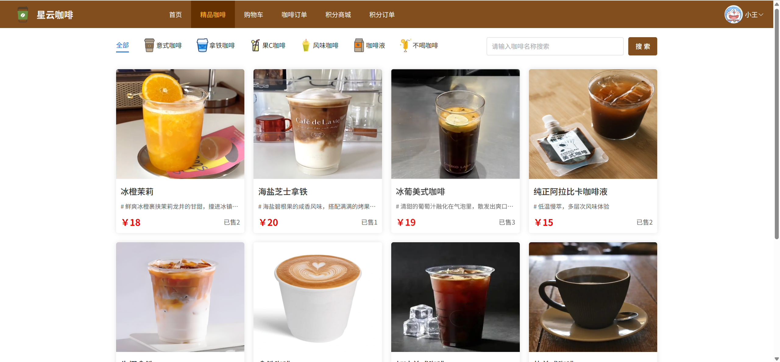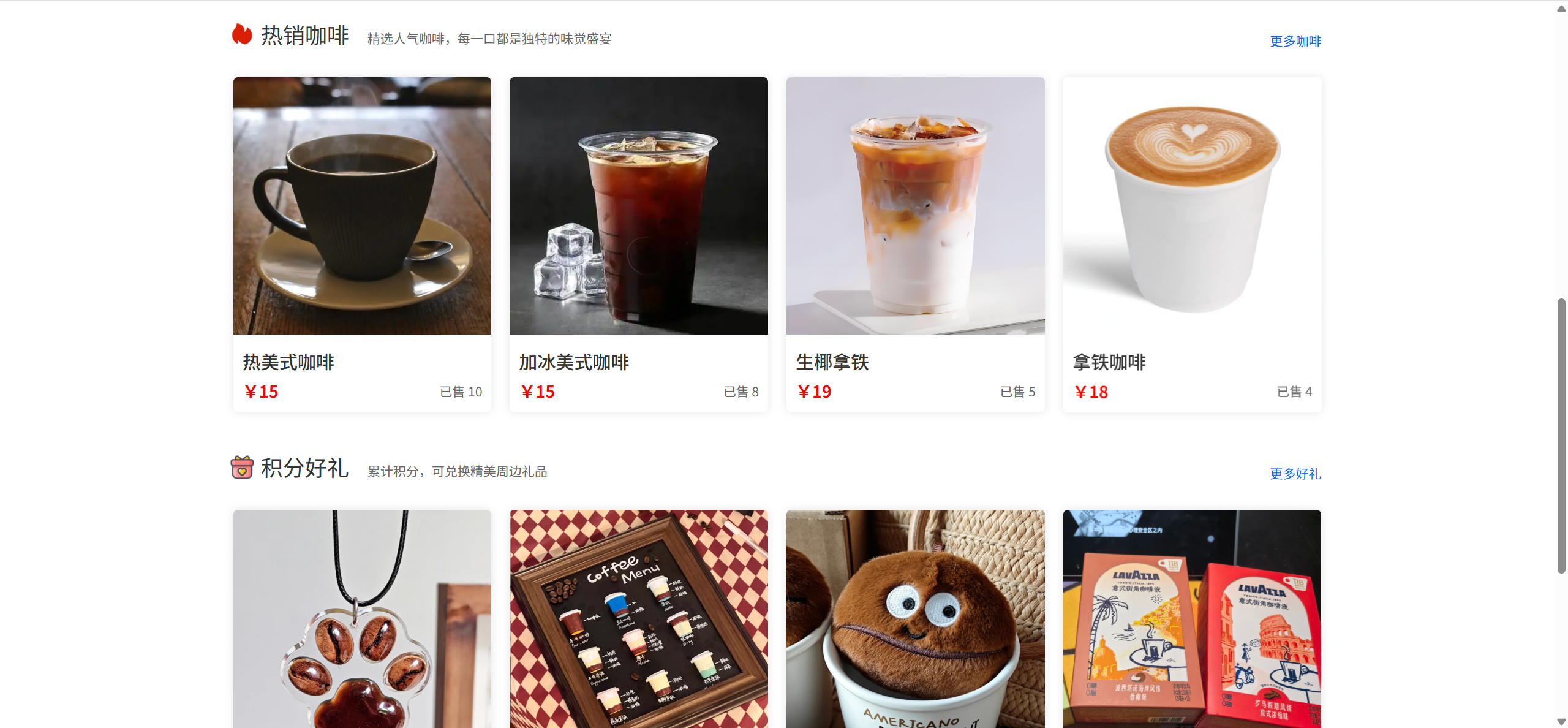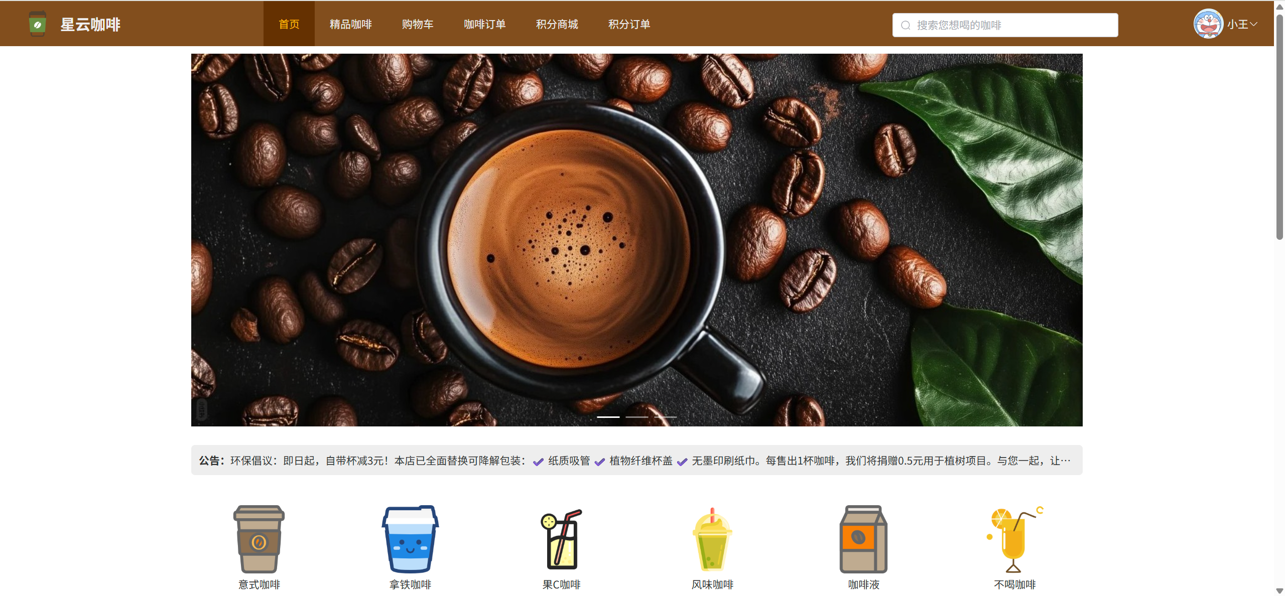 首页:查看轮播图、咖啡分类、热销咖啡推荐、系统公告