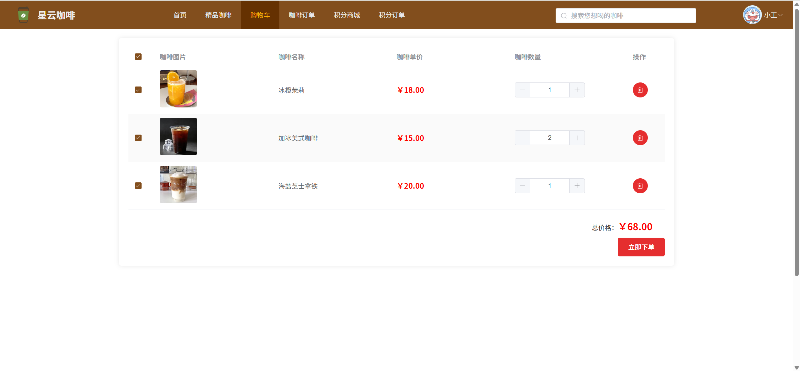 购物车:查看加入购物车的咖啡,可修改咖啡数量,可一键下单