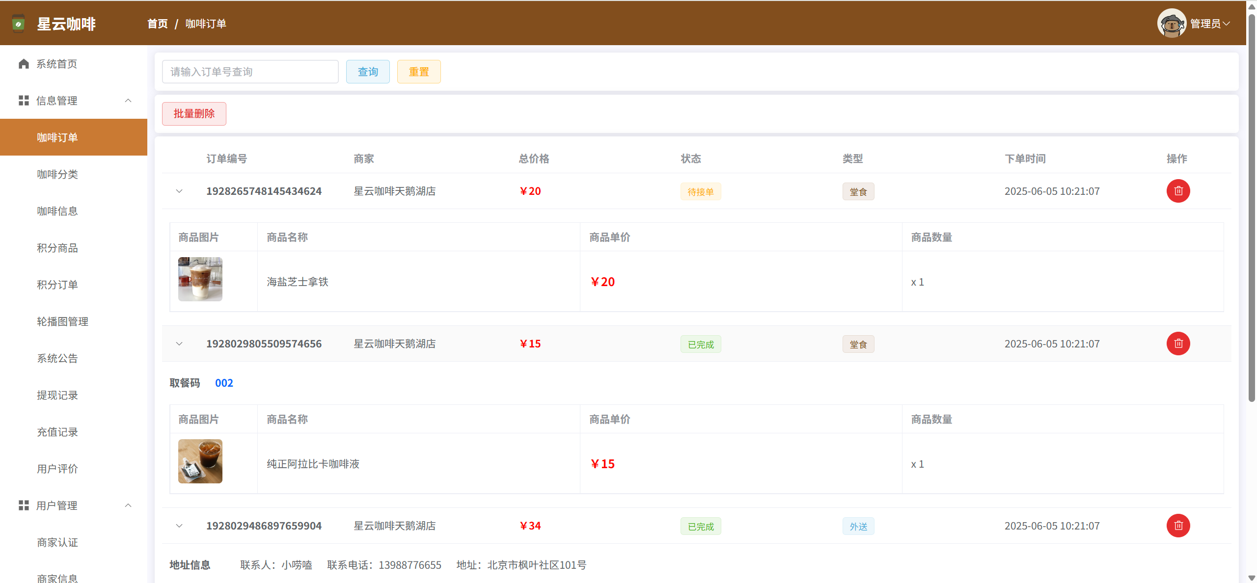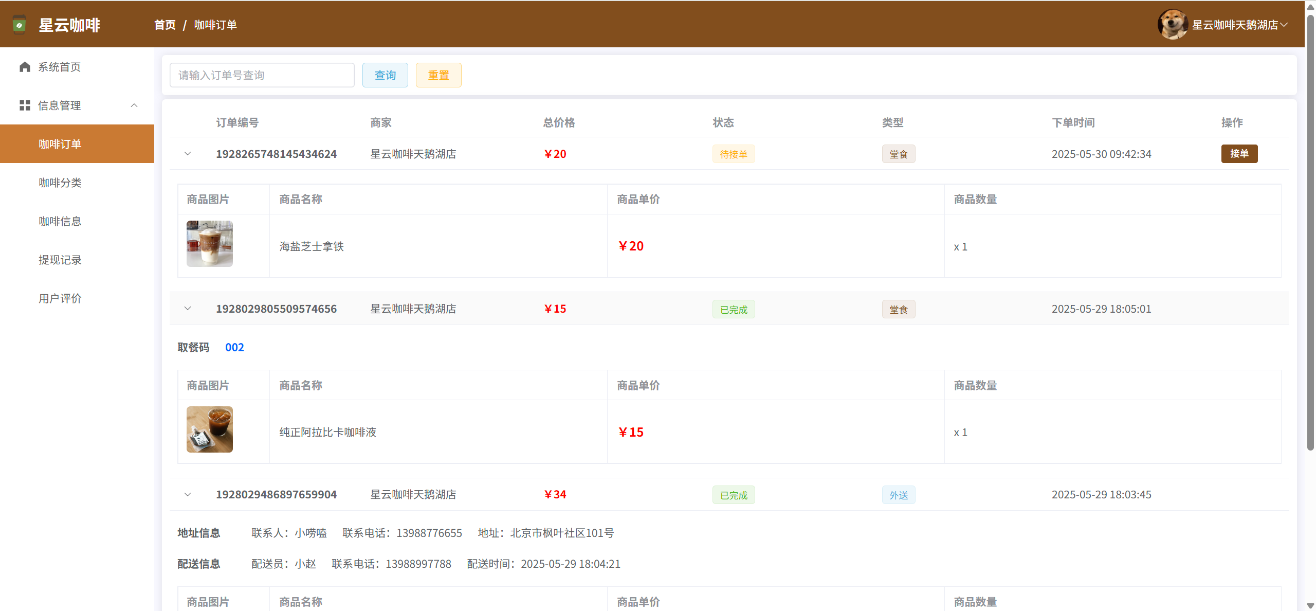 订单信息:管理本商家的咖啡点单信息,可发货、确认送达,如果是堂食订单,则设置已出餐,已取餐