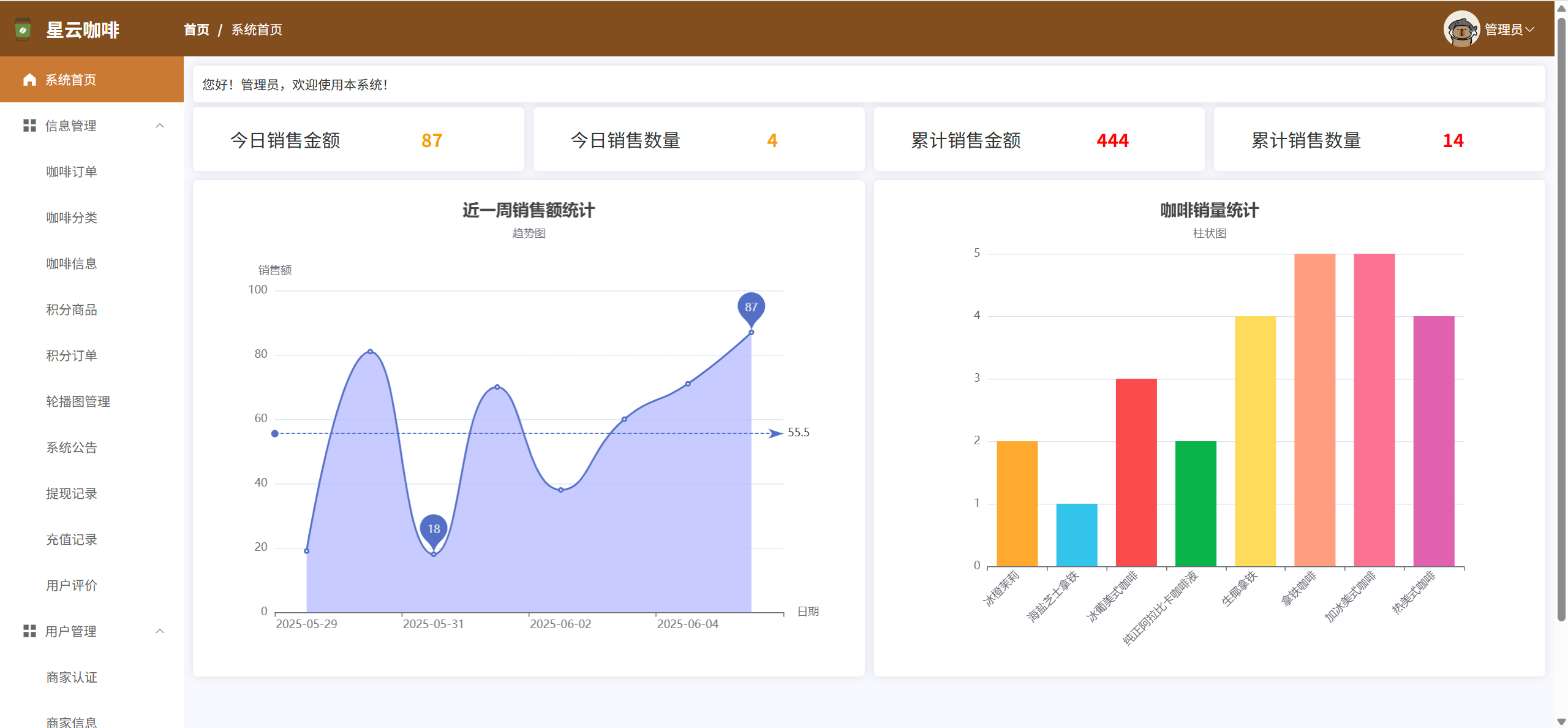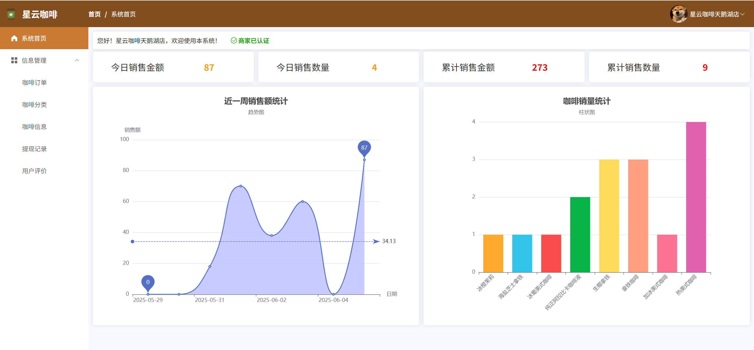数据统计:查看本商家的咖啡销售统计数据,查看本商家近一周的销售趋势图,本商家各个咖啡的销量统计图
