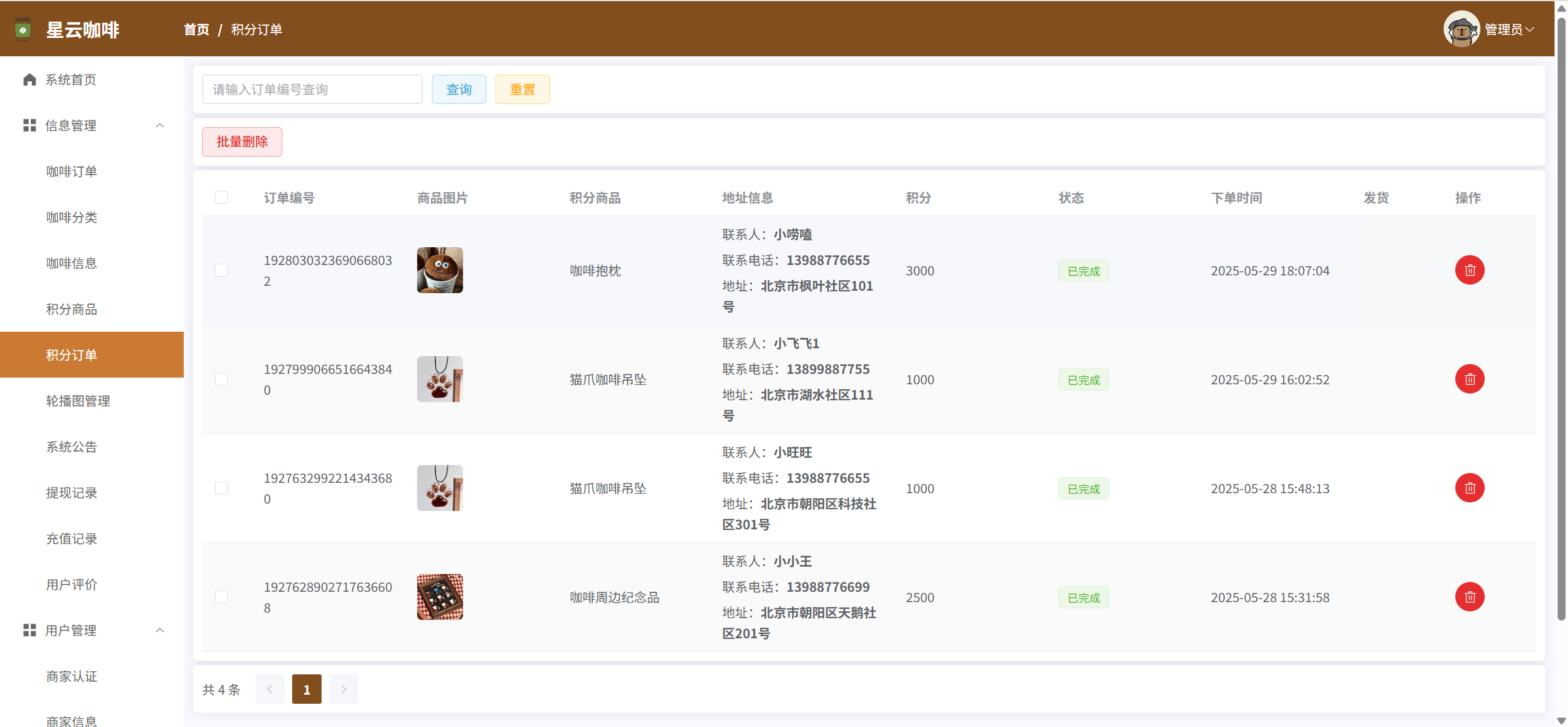 积分兑换:管理积分兑换订单,可发货