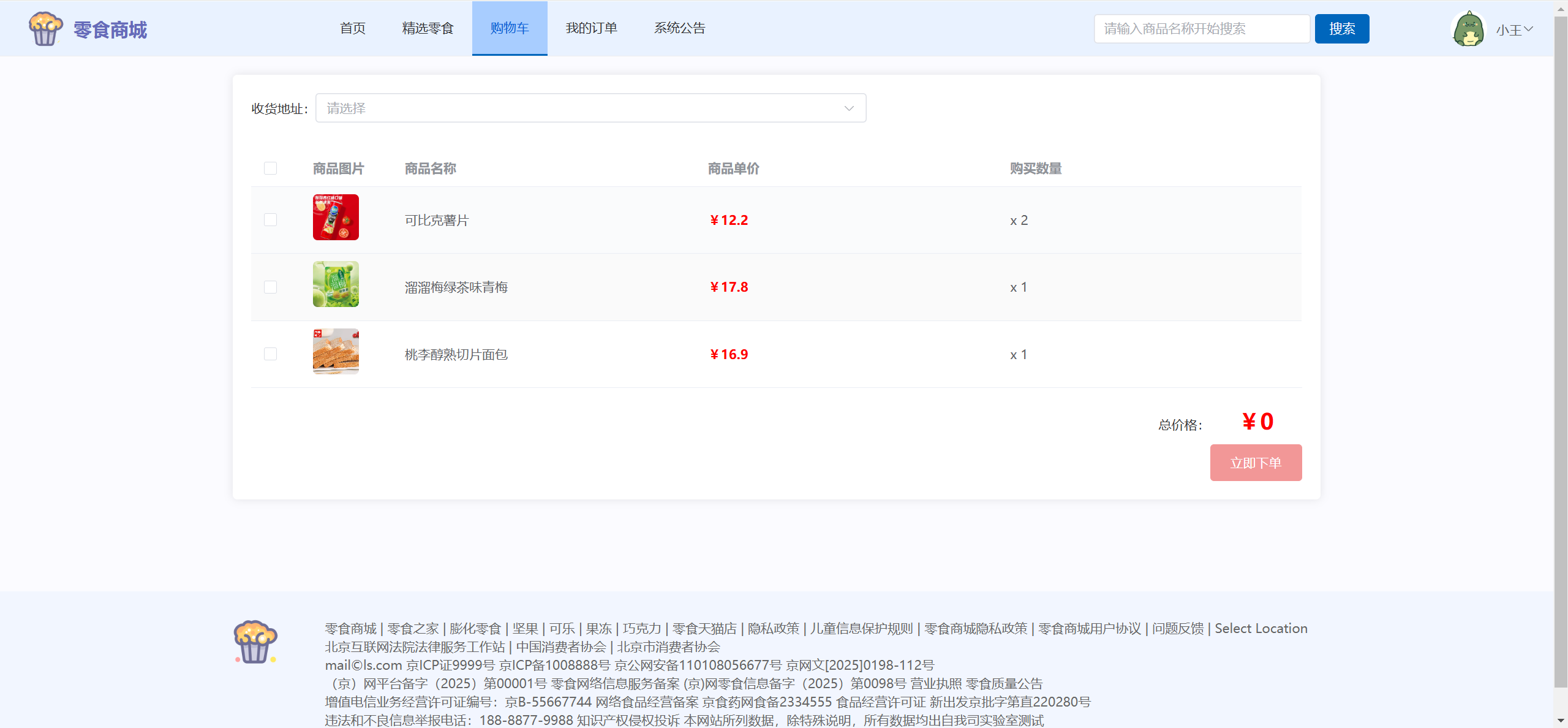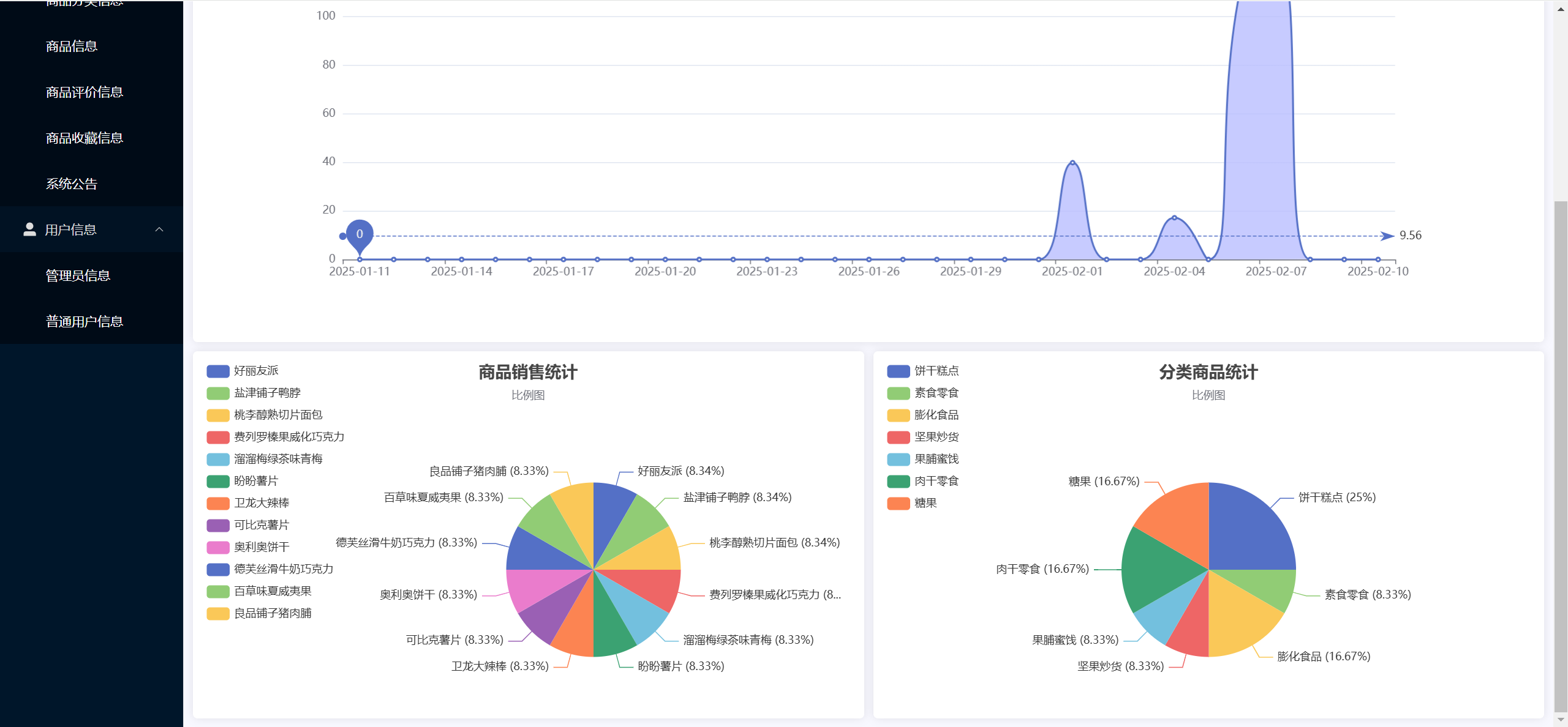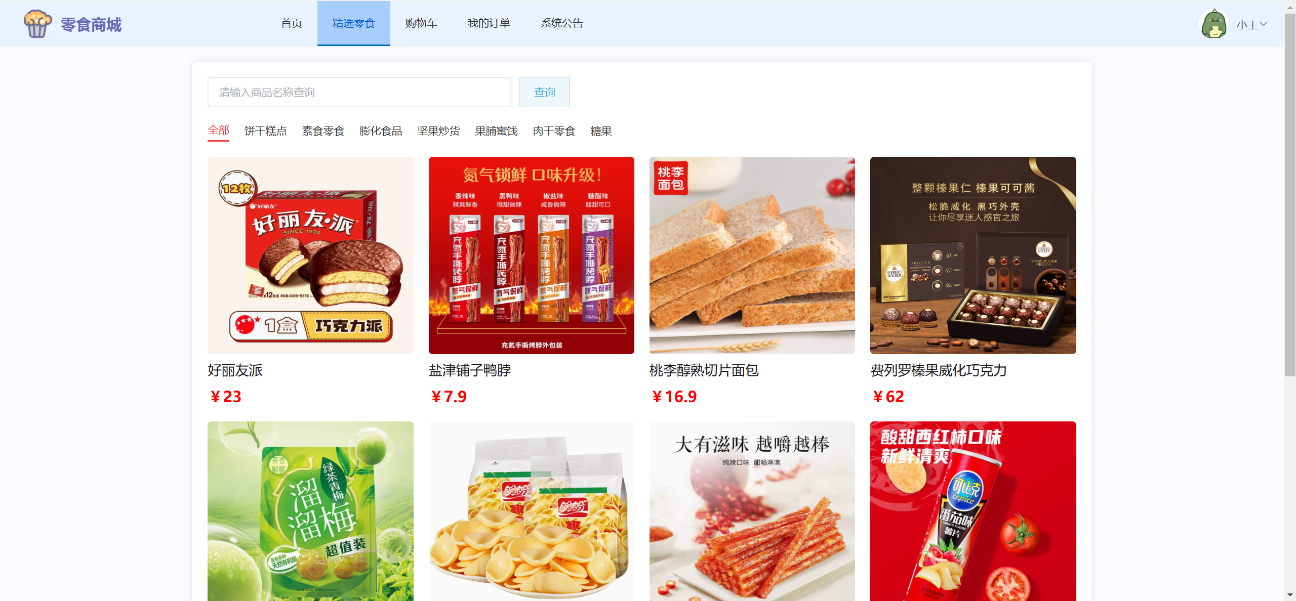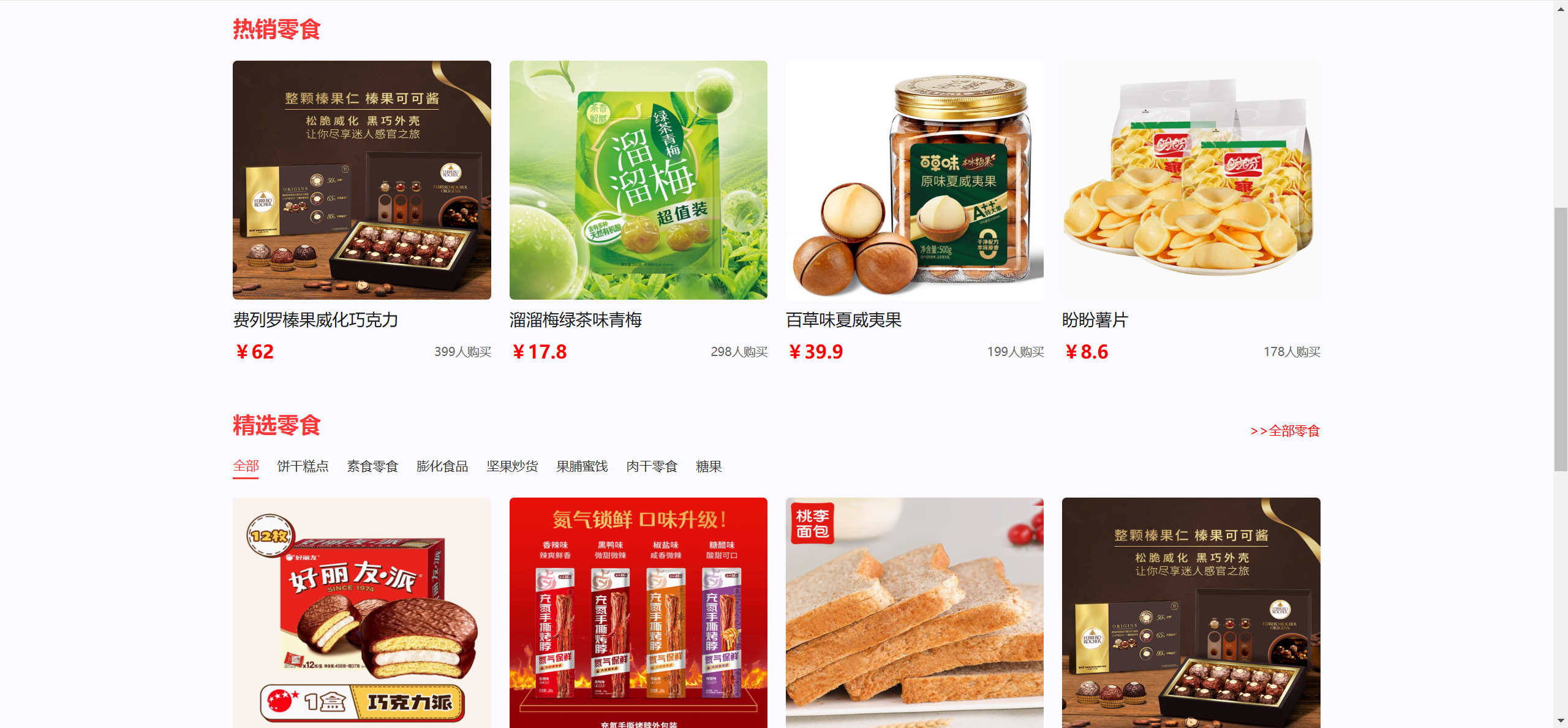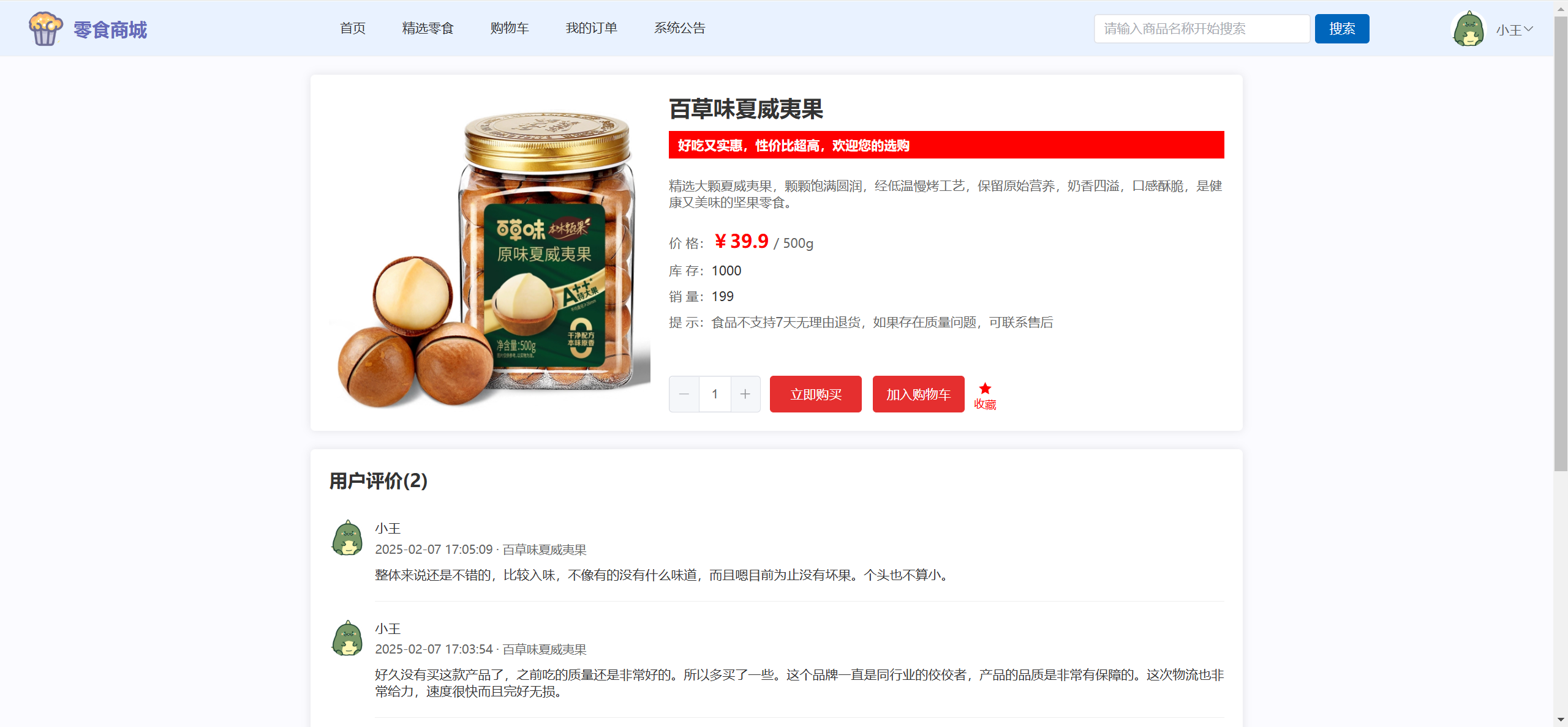 零食详情:展示零食详细信息、可购买下单、加入购物车、收藏、展示商品售后评价信息