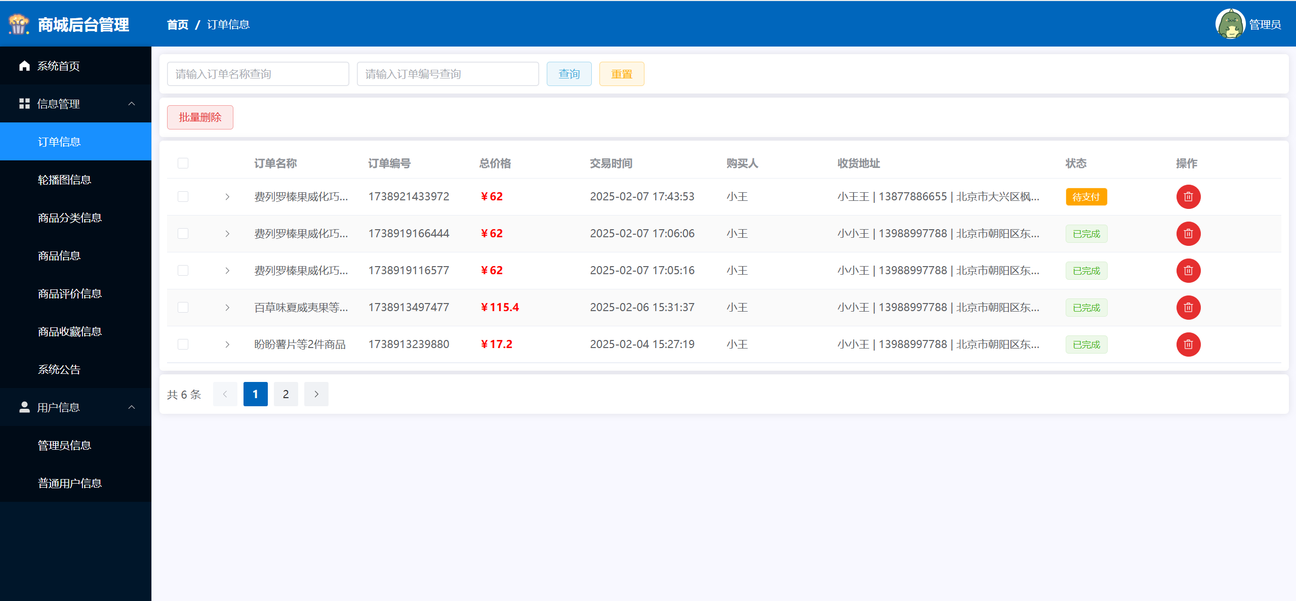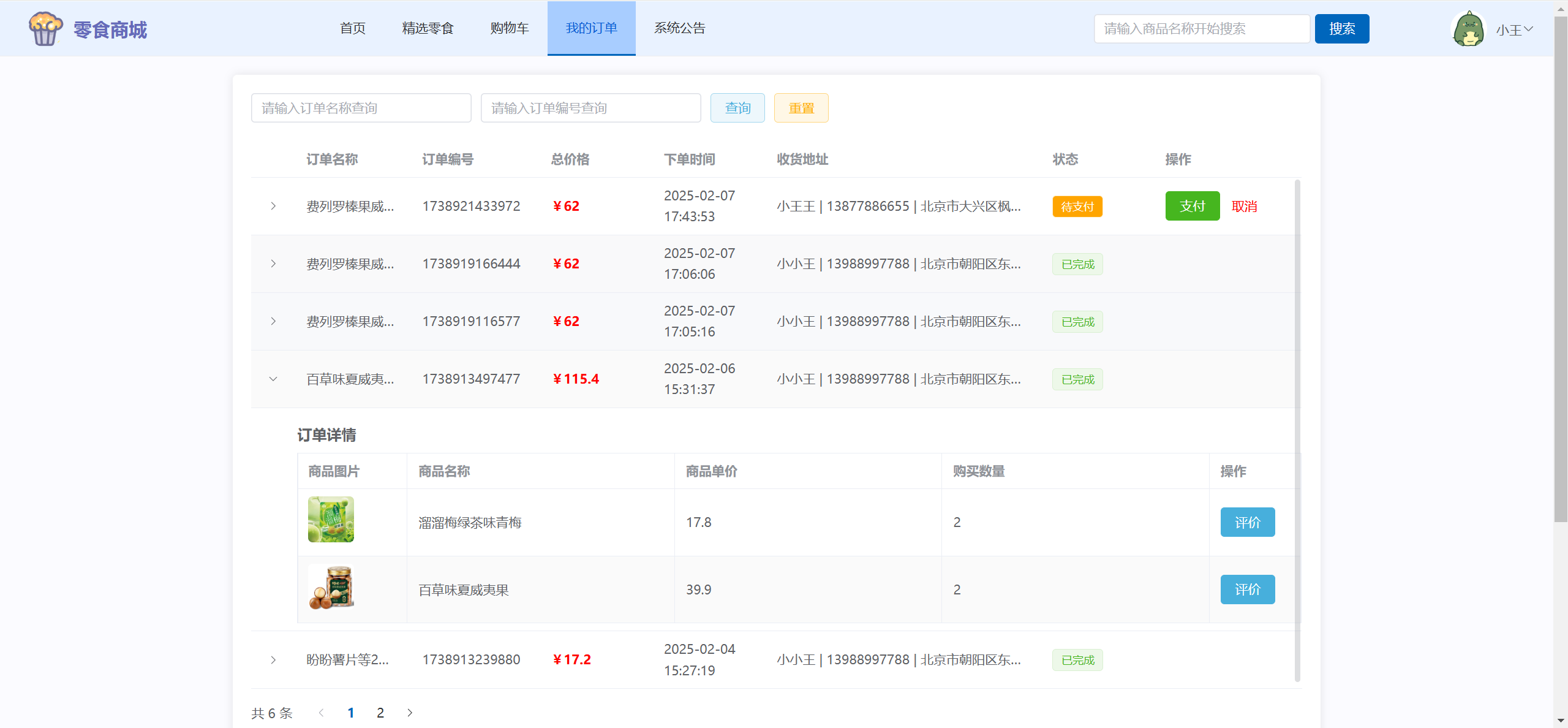 我的订单:展示历史订单,用户可支付、取消订单、可以确认收货和评价商品
