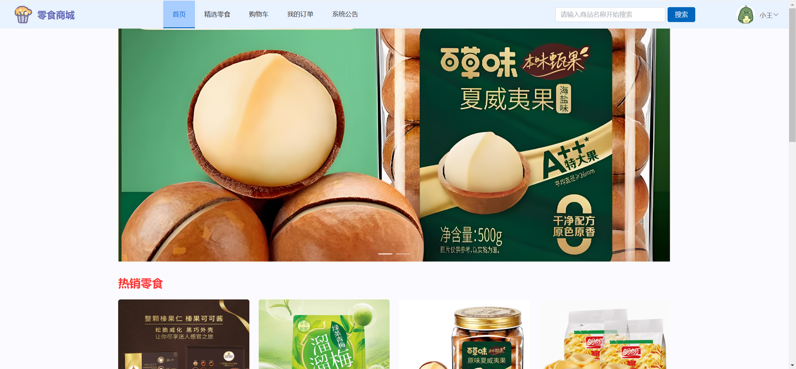 商城首页:轮播图宣传、热销商品(按销量从高往低排序展示 4 个)、精选商品