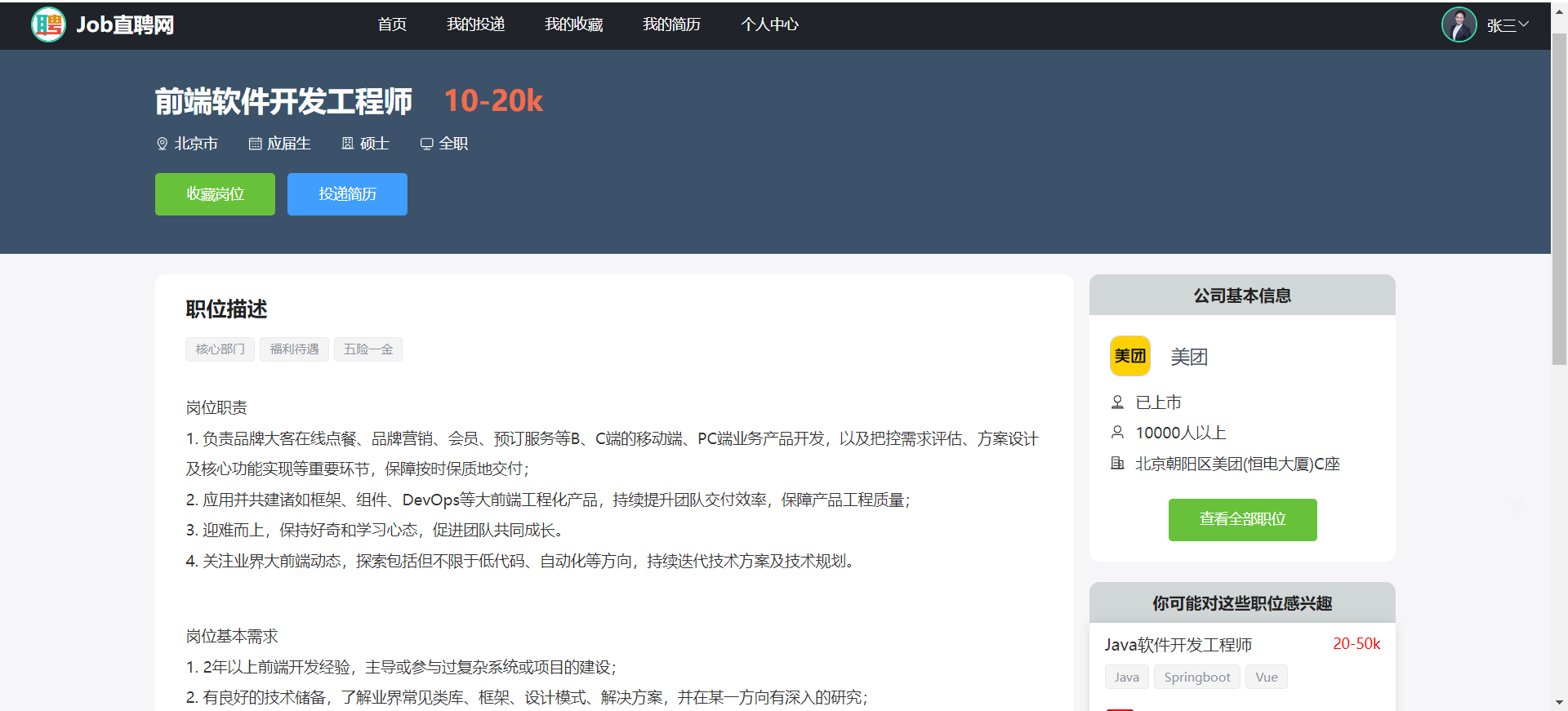 支持查看岗位详细信息,包括薪资、要求等等,投递简历