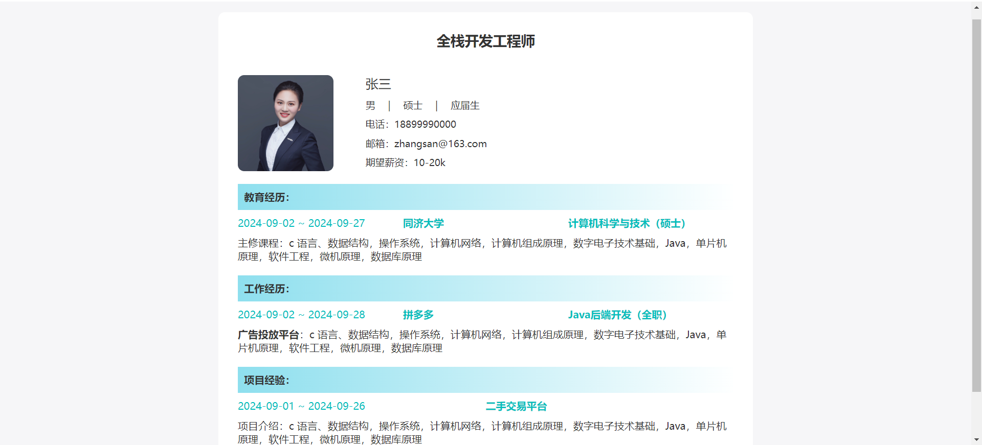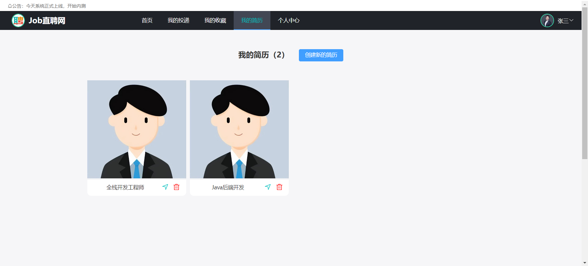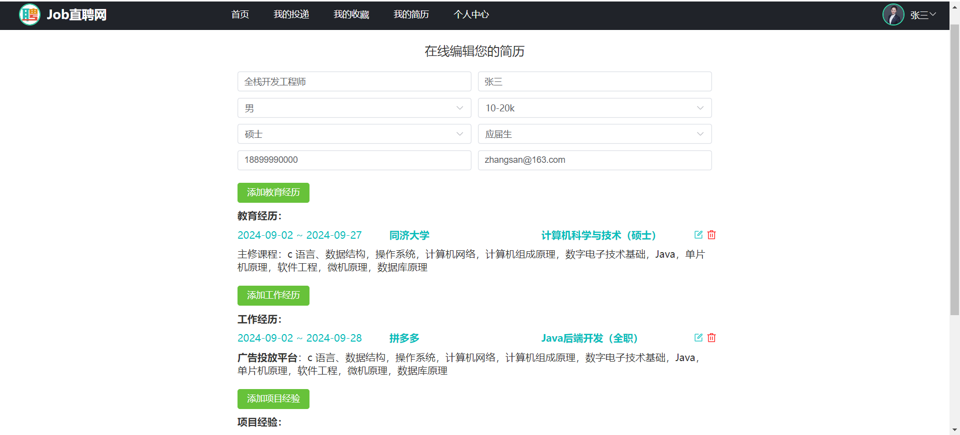 简历管理:可以管理自己的简历信息,支持在线填写简历,支持简历的在线预览