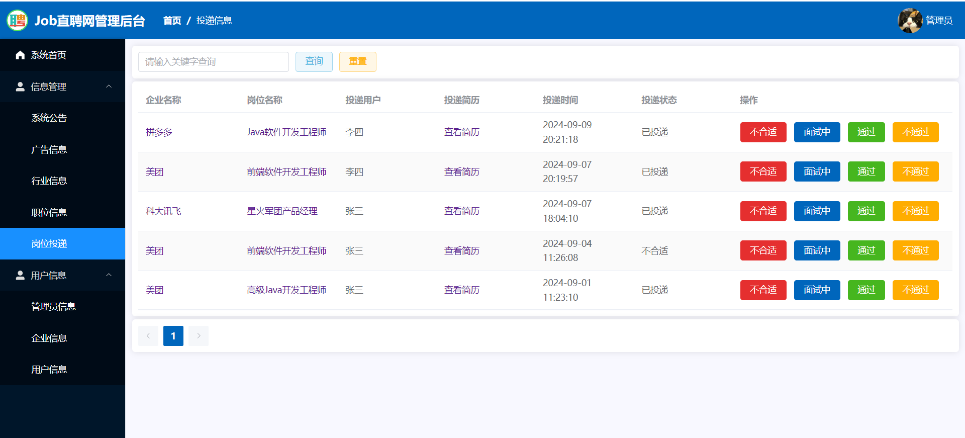 岗位投递:管理自己企业岗位的投递信息,可以在线查看用户简历,并且同步简历投递状态,包括面试中、通过或者不通过。