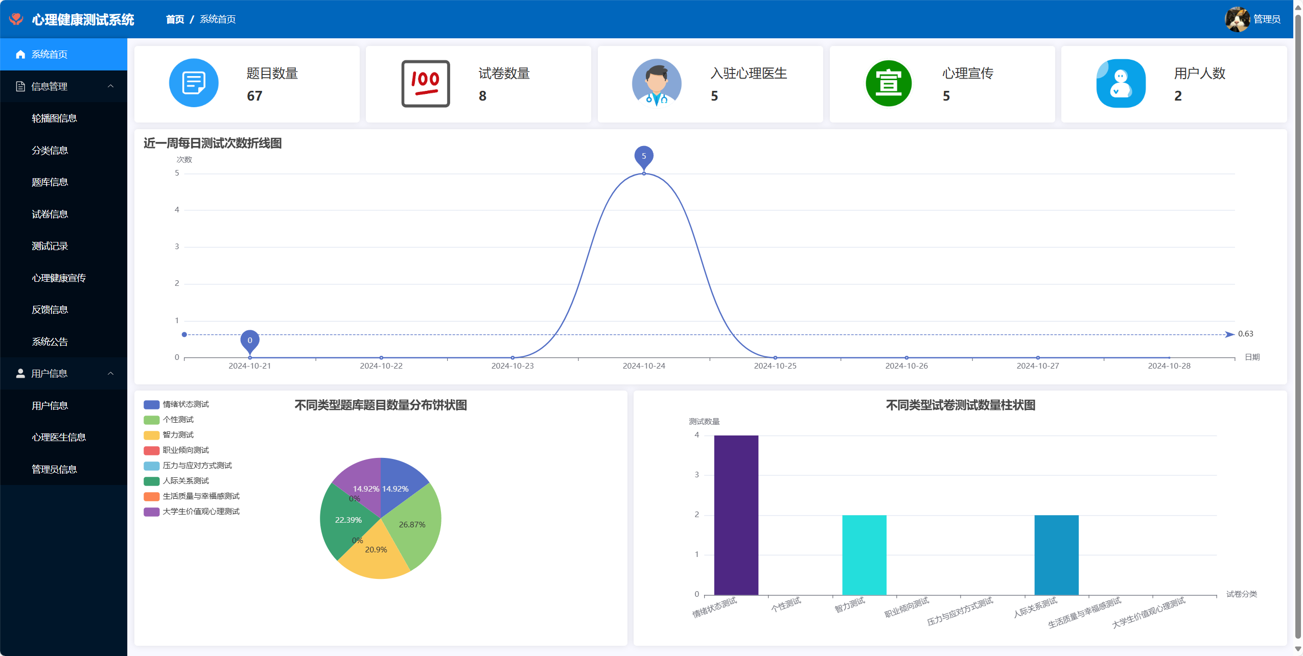 系统首页:查看关于近一周心理测试人数情况和各种题目类型题目统计
